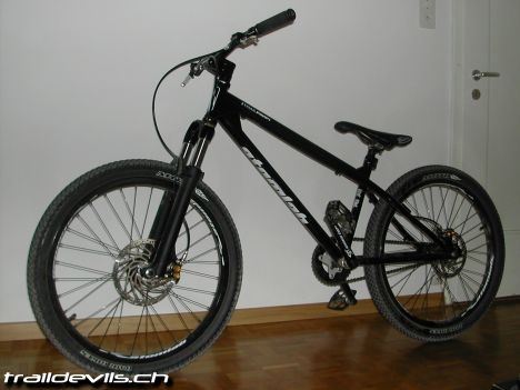 Hope mono M4 disc brakes, DJ Street Gabel, Atomlab Felgen 24\", Alutech Naben, Azonic Shorty Vorbau, Azonic double wall riser bar, Shock Therapy Hardride Kurbel, DMR Reifen und Pedalen.