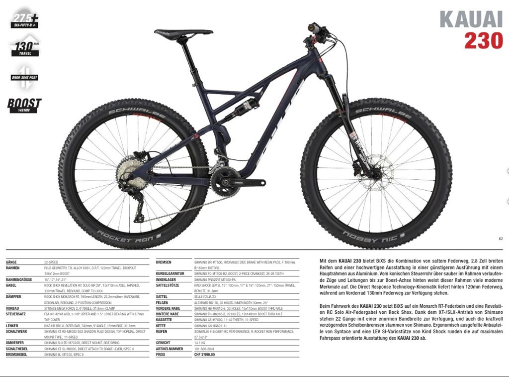Beim Fahrwerk des KAUAI 230 setzt BiXS auf ein Monarch RT-Federbein und eine Revelati-on RC Solo Air-Federgabel von Rock Shox. Dank dem XT-/SLX-Antrieb von Shimano stehen 22 Gänge mit einer enormen Bandbreite zur Verfügung, und auch die kraftvoll verzögernden Scheibenbremsen stammen von Shimano. Ergonomisch ausgefeilte Anbauteile von Syntace und eine LEV SI-Variostütze von Kind Shock runden die auf maximalen Fahrspass orientierte Ausstattung des Kauai 230 ab.