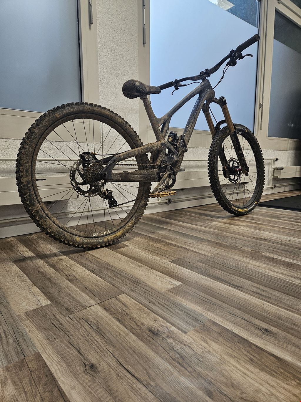 Ein Evil Insurgent LS mit FOX Factory Fahrwerk, Shimano Saint- & XTR Komponenten, selbst zusammengestellten DT Swiss Rädern mit Michelin Bereifung & Deity Komponenten.