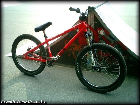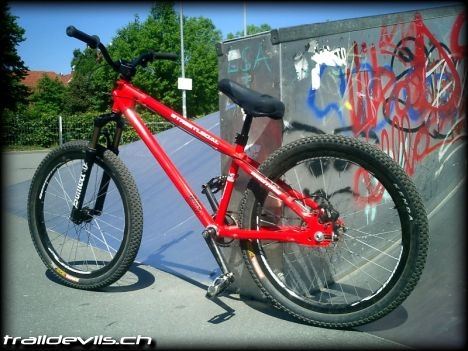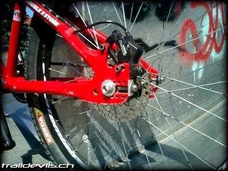 Gabel auf 80mm Federweg reduziert, Deore Naben auf Schraubachse umgerüstet, Sattelstütze/Lenker gekürzt, Shimano Deore BRM525 mit 140mm Formula Scheibe