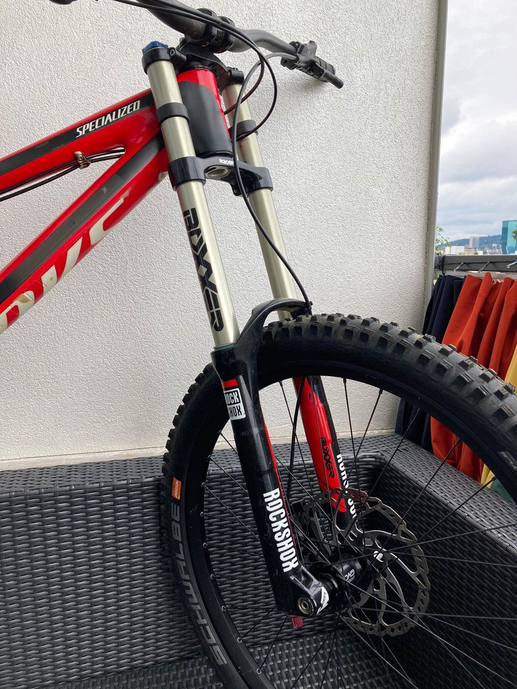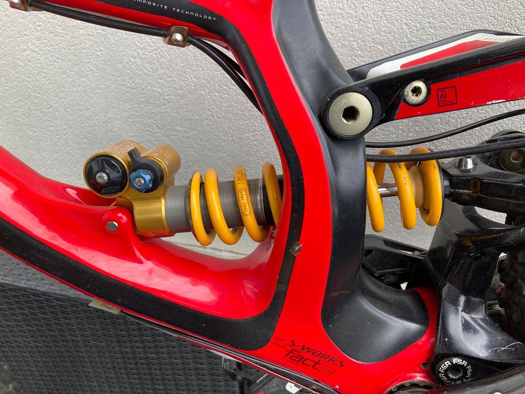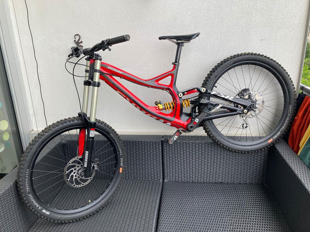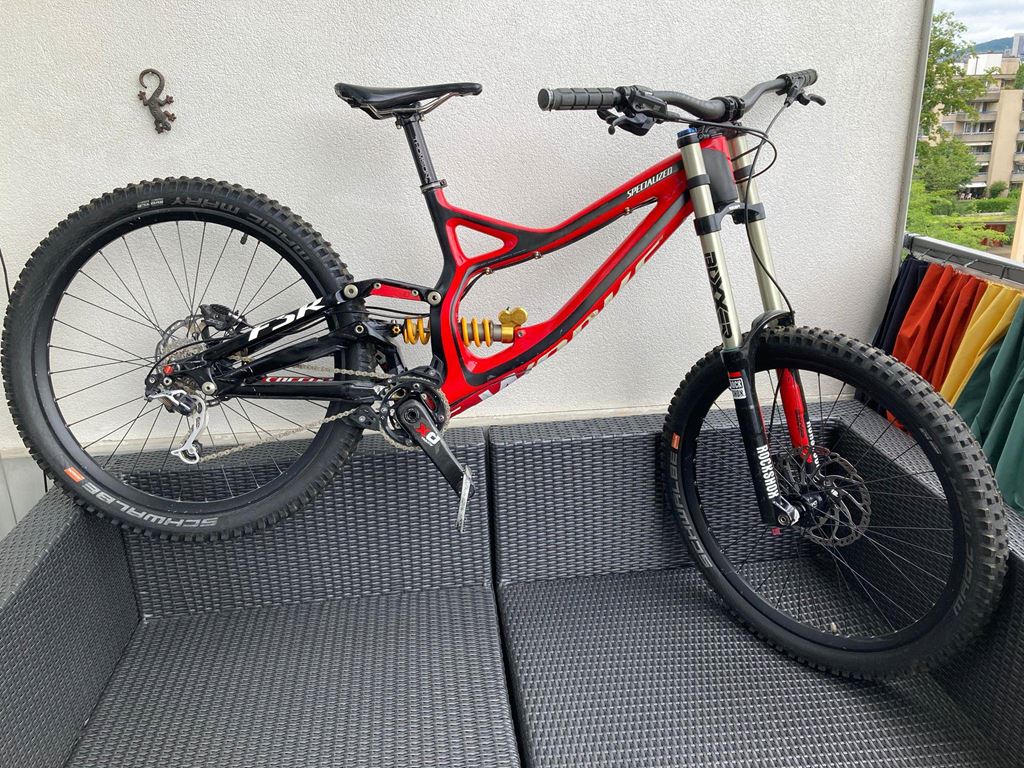 kleiner Materialfehler beim Hinterbau Bike in sehr gutem Zustand, regelmässige Wartung in der Spezialized Wekstatt Zusätzlich 2 Pneu Bremsen: TRP Quadiem 4 Kolben Dämpfer: Öhlins 200mm Gabel: Rockshox Boxxer 200