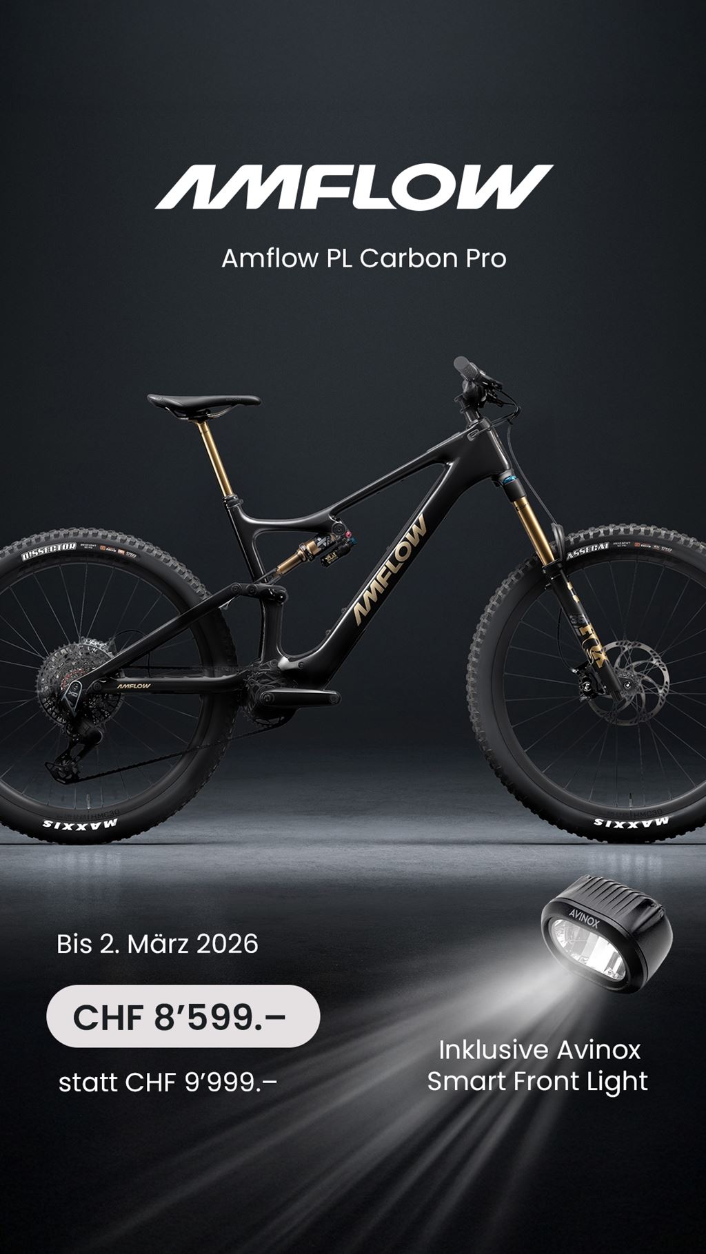 - Aktion bis 2. März 2026 statt CHF 9'999.- plus Amflow Scheinwerfer im Wert von CHF 199.- gratis dazu. Das E-Mountainbike Amflow PL bietet eine Spitzenleistung von 850 Watt und ist mit einem Gewicht von 19,2 kg ultraleicht gebaut. Mit seiner einzigartigen Kombination aus Leistung, Reichweite, Gewicht und intelligenten Funktionen ist dieses innovative E-MTB genau das Richtige für Trailblazer. 5 Modi, Effiziente Assistenz Der Auto-Modus passt die Unterstützung in Echtzeit an und der Boost-Modus bietet ein Drehmoment von 120 Nm mit 1000 W Unterstützung. Leistungsstarker Antrieb Der 2,52 kg leichte Motor liefert ein kontinuierliches Drehmoment von 105 Nm und eine Peakleistung von 850 W. Ultraleichter Rahmen Die leichte 19,2 kg Konstruktion hat einen Carbonrahmen, der nur 2,27 kg wiegt für höchste Geschwindigkeit und Agilität. 800Wh-Akku, 3x Schnellladung Das DJI Avinox Drive System mit einem 800 Wh Akku ermöglicht eine Reichweite von 157 km. Flexible Geometrie Das Rahmendesign des Amflow PL hat einen Steuerrohrwinkel von 64,5°, eine Kettenstrebenlänge von 445 mm und einen Sitzrohrwinkel von 77°. Integriertes Touchscreen Der 2" OLED-Touchscreen zeigt Echtzeit-Fahrtdaten mit Reichweite an und die Avinox App bietet Fernortungsfunktionen. Intelligent Walk Assist Der Walk-Modus mit Auto Hold verhindert ein Zurückrollen und bietet eine Berganfahrhilfe sowie das Schalten im Stand. Rahmen Carbon Gr. M, Gabel Fox 36 Float Factory Kashima 160mm, Dämpfer Fox Float X-Factory 2 Position 150mm, Schaltung SRAM X0 Transmission, Bremsen Magura MT7 4 Kolben, Sattelstütze Fox Transfer, Motor DJI AVINOX M1 Drive Unit, 105NM, Batterie 800Wh inkl. Schnell Ladegerät 12A. Monatlich ab CHF 275.35 mit Finanzierung über HeyLight. Grosser Showroom mit über 180 Lagerfahrräder Grosse Auswahl an Testbike stehen für dich bereit.