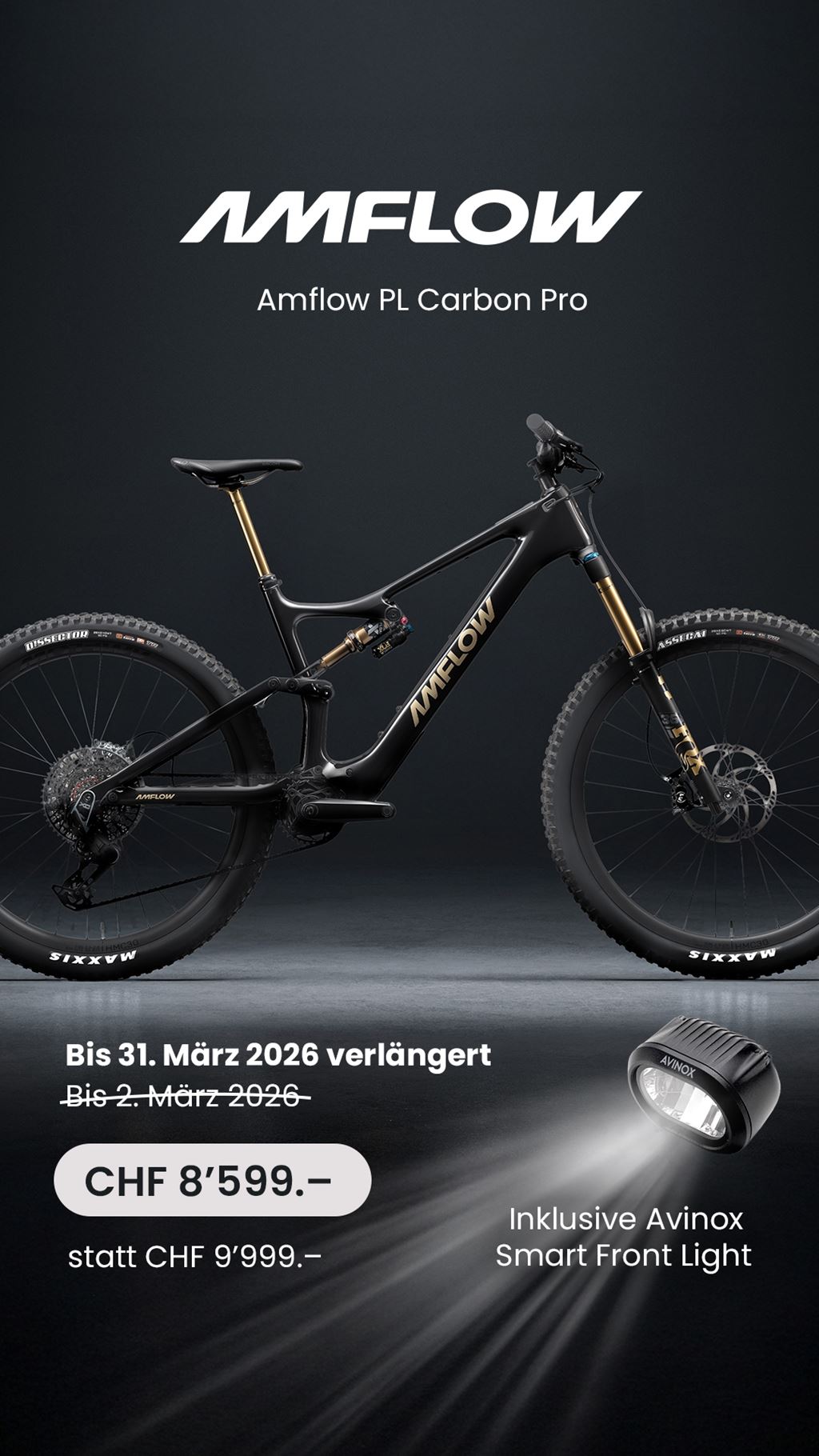 - Das E-Mountainbike Amflow PL bietet eine Spitzenleistung von 850 Watt und ist mit einem Gewicht von 19,2 kg ultraleicht gebaut. Mit seiner einzigartigen Kombination aus Leistung, Reichweite, Gewicht und intelligenten Funktionen ist dieses innovative E-MTB genau das Richtige für Trailblazer. 5 Modi, Effiziente Assistenz Der Auto-Modus passt die Unterstützung in Echtzeit an und der Boost-Modus bietet ein Drehmoment von 120 Nm mit 1000 W Unterstützung. Leistungsstarker Antrieb Der 2,52 kg leichte Motor liefert ein kontinuierliches Drehmoment von 105 Nm und eine Peakleistung von 850 W. Ultraleichter Rahmen Die leichte 19,2 kg Konstruktion hat einen Carbonrahmen, der nur 2,27 kg wiegt für höchste Geschwindigkeit und Agilität. 800Wh-Akku, 3x Schnellladung Das DJI Avinox Drive System mit einem 800 Wh Akku ermöglicht eine Reichweite von 157 km. Flexible Geometrie Das Rahmendesign des Amflow PL hat einen Steuerrohrwinkel von 64,5°, eine Kettenstrebenlänge von 445 mm und einen Sitzrohrwinkel von 77°. Integriertes Touchscreen Der 2" OLED-Touchscreen zeigt Echtzeit-Fahrtdaten mit Reichweite an und die Avinox App bietet Fernortungsfunktionen. Intelligent Walk Assist Der Walk-Modus mit Auto Hold verhindert ein Zurückrollen und bietet eine Berganfahrhilfe sowie das Schalten im Stand. Rahmen Carbon Gr. M, Gabel Fox 36 Float Factory Kashima 160mm, Dämpfer Fox Float X-Factory 2 Position 150mm, Schaltung SRAM X0 Transmission, Bremsen Magura MT7 4 Kolben, Sattelstütze Fox Transfer, Motor DJI AVINOX M1 Drive Unit, 105NM, Batterie 800Wh inkl. Schnell Ladegerät 12A. Monatlich ab CHF 324.70 mit Finanzierung über HeyLight. Grosser Showroom mit über 180 Lagerfahrräder Grosse Auswahl an Testbike stehen für dich bereit.