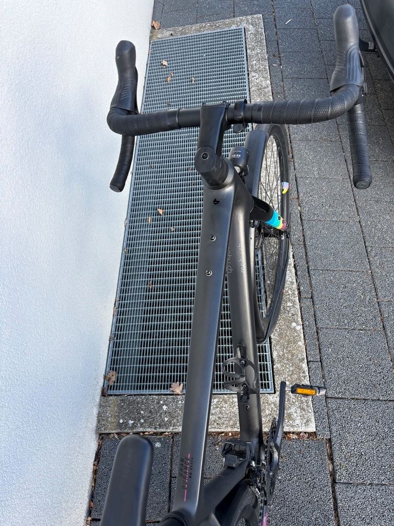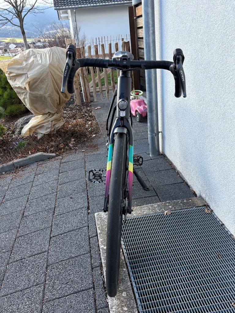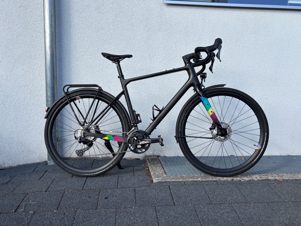 - Das Gravel wurde lediglich ein Jahr gefahren. 28", ultra lite HSC Carbon BGM Allroad Starrgabel, Carbon, Scheibenbremsaufnahme, Steckachse Shimano GRX, 2x11 Shimano GRX, hydraulische Scheibenbremse Syncros Capital Felgen, Shimano Nabendynamo Schwalbe G-One Speed, folding, 40-622 B&M IQ XS LED, 80 Lux / B&M Toplight LED