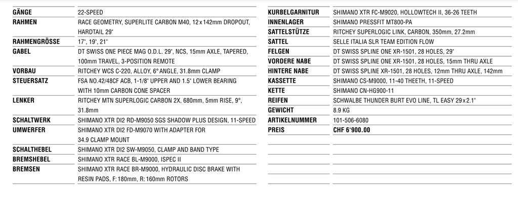 - Bixs Core Team Hardtail. Rahmengröße 17" M. Schaltung Shimano XTR Di2 (elektronisch) Bremsscheiben Shimano XT vorne 203, hinten 180 mm Federgabel DT Swiss 100 mm mit Lockout. Räder DT Swiss XR 1501, mit neuen Schwalbe Racing Ralph. Velo in sehr gutem Zustand, leichte Gebrauchsspuren.