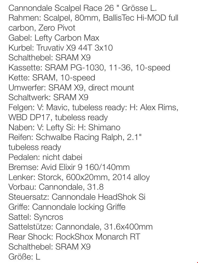 - Guten Tag Sie sehen hier ein Bike der Marke Cannondale. Details des Bikes können sie dem letzten Bild entnehmen. Die Grundausstattung des Lefty ist 2 Jahre alt und wurde selten und nur auf normalen Trails gefahren. Der Carbonrahmen (inkl. des RockShox Dämpfers) wurde kürzlich durch einen Fahrradmechaniker ersetzt, da der letzte einen kleinen Haarriss aufwies. Aber auch der MTB Sitz, Pedalen und die Reifen wurden letztens gewechselt. Die lebenslange Garantie von Cannondale wurde noch nicht eingelöst und kann somit vom künftigen Neubesitzer eingelöst werden. Besichtigung / Probefahren kann in der Region Olten gemacht werden. Preis Verhandelbar