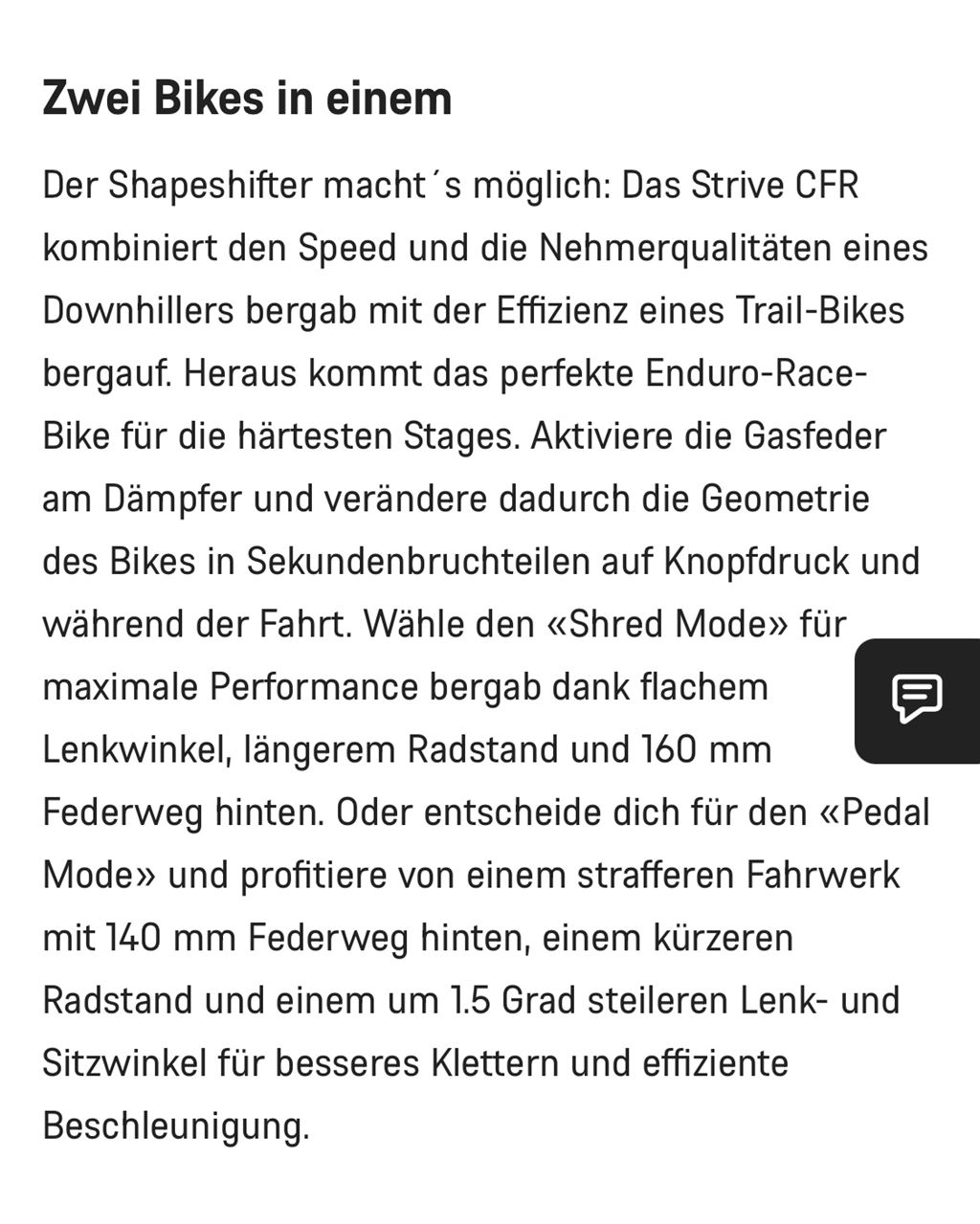 - Canyon Strive CFR 2023 mit Shapeshifter Top gepflegtes Enduro Bike mit hochwertigen Komponenten zu verkaufen. Zusätzliches Zubehör als Package oder nur das Bike. - Bike gem. Fotos: Verhandlungsbasis Fr. 2'500.- - Bike mit Zubehör gem. Fotos/Liste: Verhandlungsbasis Fr. 3'000.- - Neupreis 5'900.- Gekauft: Dezember 2022 Grösse: M (172 – 185cm) Das Bike weist normale Gebrauchsspuren auf und wurde immer sehr gut gepflegt. Der originale Dämpfer FOX X2 Factory Kashima wurde gegen einen Rockshox Super Deluxe Ultimate RC2T 2023 mit 450-er Feder ausgetauscht. Der Originaldämpfer ist im Package enthalten. Details zum Shapeshifter und Grössentabelle in der Bildergalerie. Zubehör im Package: - Originaldämpfer FOX X2 Factory Kashima - Ersatzfeder zu Coil-Dämpfer (550/650) - Cushcore Pro 29 - Bremsbeläge zu XTR (3x Sinter / 1x Resin) - 2x Kette Shimano CN-M7100 12s (original) - Kassette Shimano XT, 12-speed 10-51 (gebraucht) - Kettenblatt Raceface 12T (gebraucht) - Ersatzbremsscheiben gebraucht - Diverse Pedale gebraucht: (2x Flat / 1x Klick / 1x Magnet) - Box mit Originalteile, Dämpferpumpe und Manual. Abholung und Barzahlung Weitere Details bei Interesse oder bei Besichtigung.