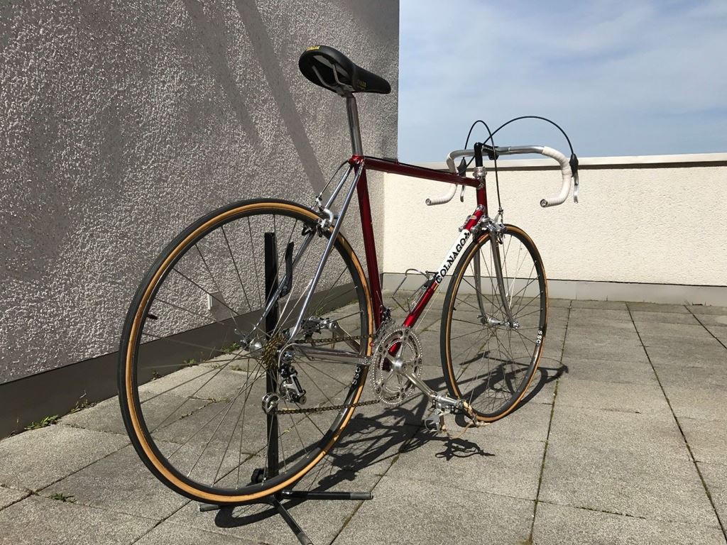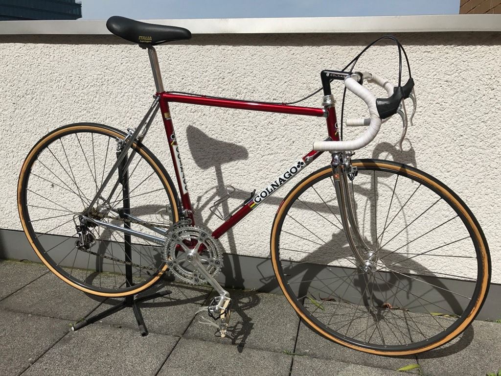 - Colnago New Mexico in blutrot mit Campagnolo Super Record Titan Pantographen Groupset. Erbaut von Claus Lauer in Altenkirchen (Deutschland) für den Wettbewerb mit Spezialausrüstung, original 82' / 83'. Seriennummer E001. Rahmen und Gabel Colnago New Mexico - Colnago Columbus Profilrohre, Original Decals in perfektem Zustand -Headset Campagnolo Super Record. -Unterplatte Campagnolo Super Record. -Kappe 175 Strada Campagnolo Super Record Panto, perforierte Zähne 44/54. -Brakes Campagnolo Super Rekord. -Brake Hebel Campagnolo Super Rekord Panto Colnago. -Umwerfer Campagnolo Super Record Pat. 82. - Schaltwerk Campagnolo Super Record. -Schiebe Campagnolo Super Rekord Panto Colnago. -Sattelstütze 27,2 mm Campagnolo Super Record. -Hubs Campagnolo Super Record 28 Loch. -Räder Mavic SSC Special mit Messerspeichen 28. -Reifen Clement Criterium. -Pedals Campagnolo Super Record, Zehenspangen Campagnolo superleggeri Super Record Alu. -Alfredo Binda ORO Zehenriemen. -Seat Selle Italia Superleggera Leder, extrem selten. -Stern Cinelli schwarz Panto Colnago c-c 100 mm. -Sternbar Cinelli Campione Del Mondo 66-42. -Sprosse Regina Oro 6 Speed ??83, Mega Sound. -Chain Regina Record ORO perforiert. -Flaschenhalter COBRA in Chrom.