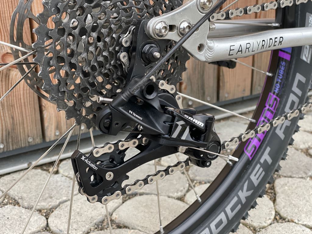 - Custom Early rider T24 with very low weight and top notch parts ! The whole bike has been serviced. No worries for a while... Grips & pedals color can be changed to better align with your kid's taste. Frame : Early Rider T24 Works / Suspension : Rock Shox SID XX / Service done by Suspension Center in Dec. 2025 Wheels : handmade wheels / Hope RS4 hubs, Crest MK3 rims, Sapim CxRay spokes Tubes : Schwalbe Rocket Ron 2.1 NEW Brakes : Shimano XT / Service done Brake discs : Sram Seatpost : Richtey NEW Seat : SDG Kids NEW Crankset : Shimano Zee shortened at 135mm Ring : 30T race face Shifter : Gx Derailleur : GX X1 NEW Chain : Sram X1 NEW Stem : Newmen Handlebar: Spank Spike cut at 650mm Grips : Gusset NEW Pedals : SFG Kids NEW Weight : 9.4kg !