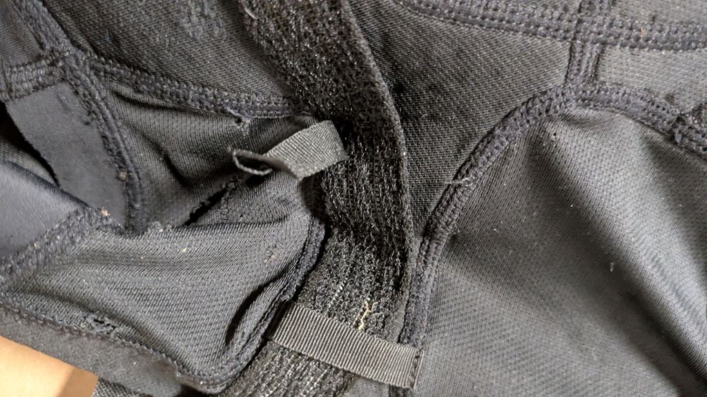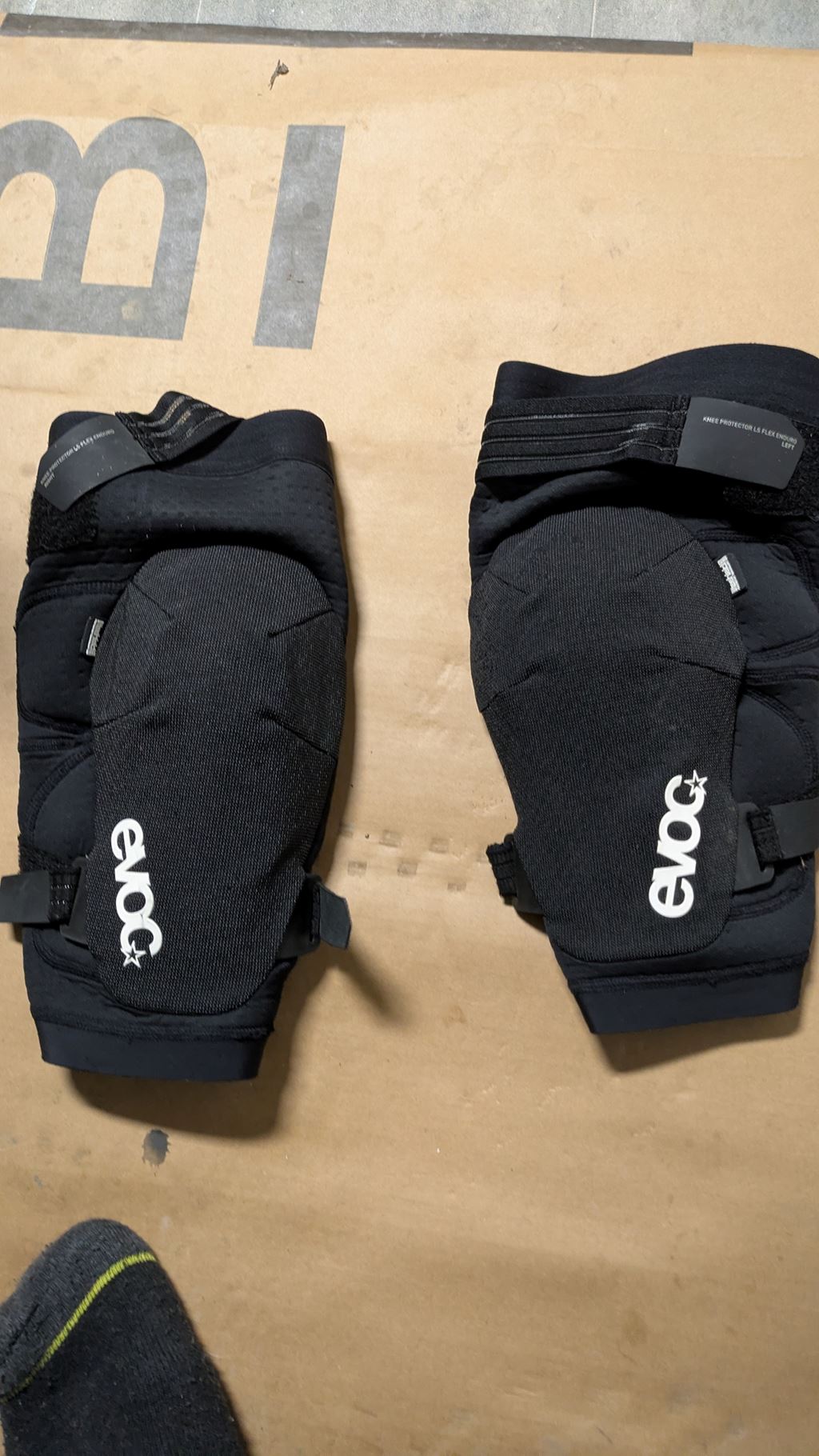 - Evoc Knieschoner in Large. Der rechte hat ein bändel lose wo der straps vor dem Anziehen in Position hält. Mir sind sie zu eng