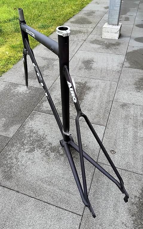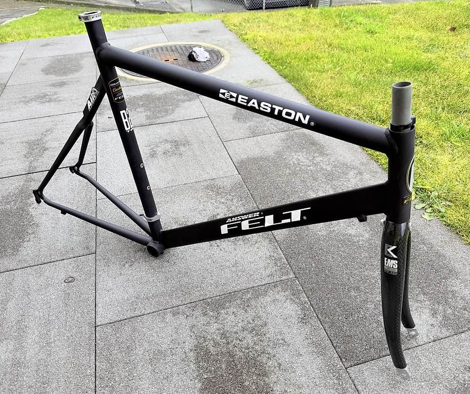 - Neuer Aero-Tria-Rahmen inkl. Karbongabel zu verkaufen! - Rarität, für Sammler! - Modell Rahmen: B2 TRIATHLON, EASTON Aluminium - Modell Gabel: KESTREL EMS Composite, Carbon - Made by ANSWER for FELT, USA made by Jim Felt - EASTON Custom Rohrsatz - Jahrgang 1997!! - ungebraucht und neu - Farbe: Schwarz eloxiert / Carbon - Grösse: 58cm - für Laufradgrösse 650B - Gewicht: ca. 1000g (nur Rahmen) - für 1 Zoll Steuersatz Kann schweizweit mit B-Post für CHF 11.50 versendet werden. Abholung in Ennetmoos / NW.