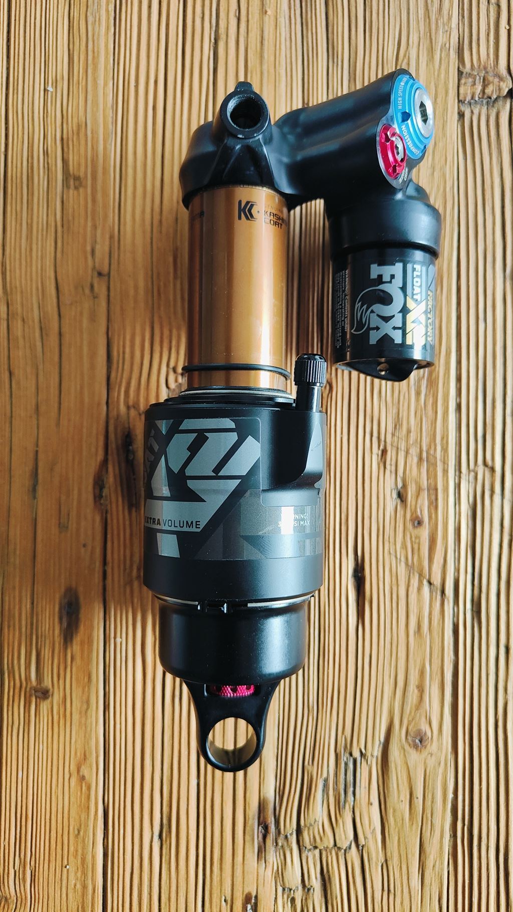 Dämpfer: Fox Float X2 EVOL Factory Kashima Fox Float X2 Factory, 185x55mm Trunnion Mount, High/Low-Speed Traction & Compression Stage with 2-Position Lever, Kashima Coating