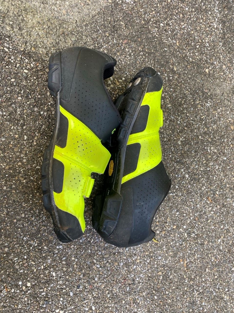 - Characteristics of these cycling shoes: Type: MTB (mountain biking) Color: Lime green with black details Fastening: Velcro and buckle Sole: Carbon (probably) Compatibility: SPD (2-bolt cleats) Size: 44EU Features: High stiffness: Carbon sole for efficient power transfer. Low weight: Optimized for racing and performance riding. Comfort: Ergonomic design and breathable material. Durability: Reinforced toe and heel for protection. Usage: These shoes are designed for demanding cyclists who seek high performance and comfort when riding a mountain bike. They are suitable for racing, marathons, and long training rides. The price of these shoes ranges from 150 to 250 euros, depending on the seller and current promotions. * Location: Adliswil, Zurich, Switzerland * Negotiation: I am willing to negotiate the price slightly for a fast and straightforward deal with cash payment.