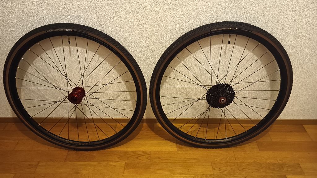 - Neuwertiger Laufradsatz, nur 3mal kurz gefahren. Naben: Hope Pro 4, rot, 32 Loch Einbaubreite vorne: 110mm Einbaubreite hinten: 148mm Einbaubreiten können über Endkappen angepasst werden, etwa an 100/142 - bitte via Hope informieren 12mm Steckachse vorne und hinten - kann vorne mit anderen Endkappen auf 15mm angepasst werden Bremsscheiben: 6 Loch Freilaufkörper: Shimano 11/12 Fach Felgen: Hope Fortus 23, Alu, 23mm Innenbreite Speichen/Nippel: Sapim Kassette: Sunrace 11-fach, 11-36t Reifen: Specialized Pathfinder 35mm Schläuche mit frz. Ventil Laufradsatz kann auch ohne Reifen/Kassette gekauft werden oder evtl. mit Bremsscheiben. Abholung präferiert, Versand auf Anfrage.