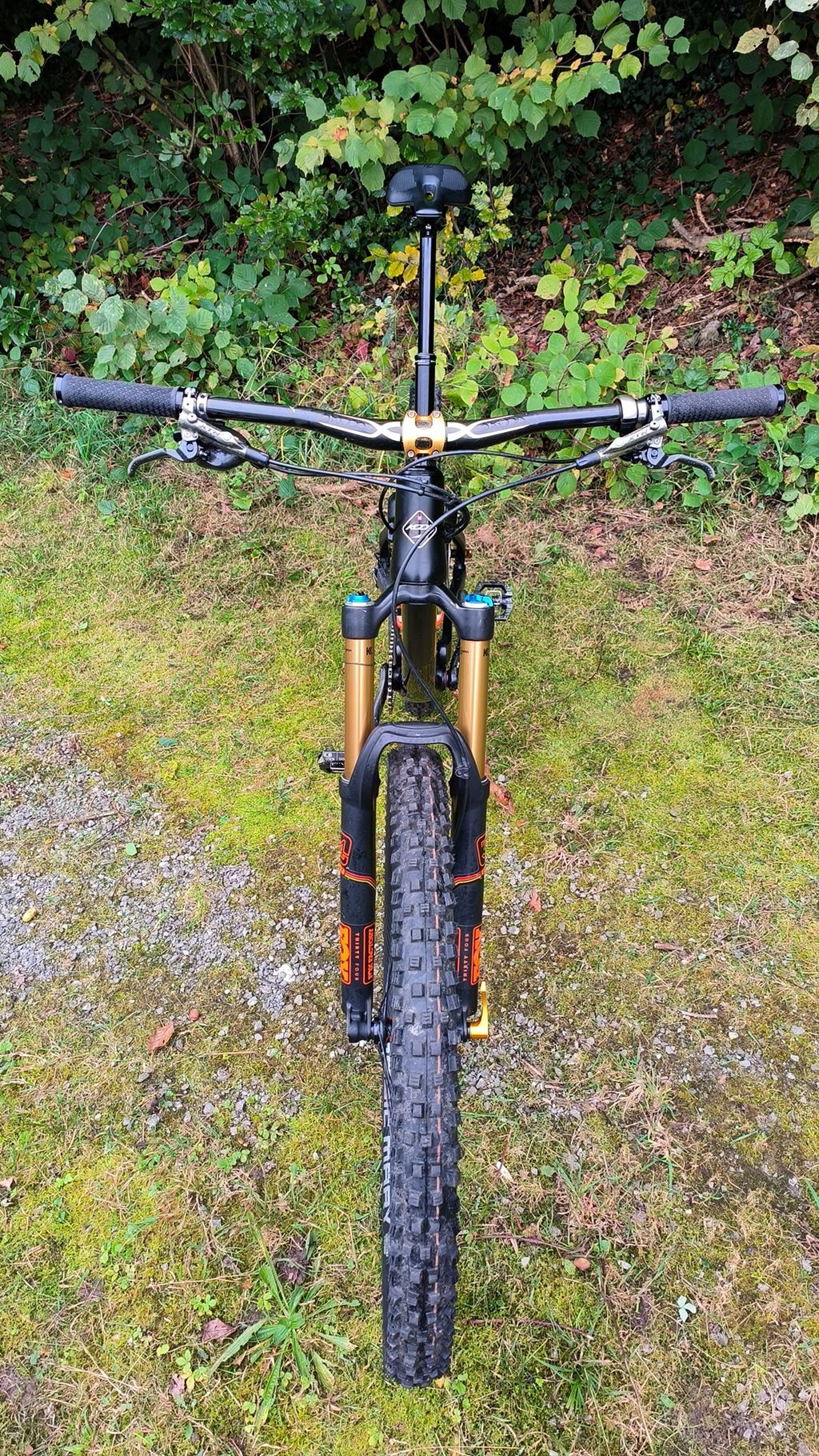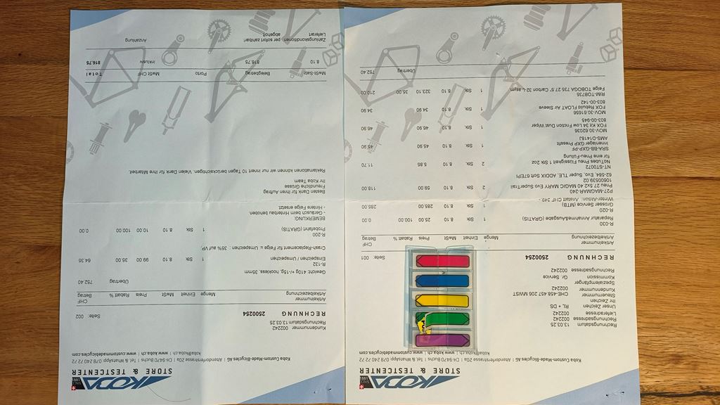 - KOBA Reamol C1 mit hochwertigen Komponenten und normalen 8-jährigen Gebrauchsliebes-Spuren :) Ein grosser Service wurde von KOBA selber diesen Winter für 816 CHF gemacht (siehe Bild) danach wurde das Bike nicht mehr benutzt. Carbon Rahmen: Grösse M Carbon Felgen: 27.5`` (die hintere ist Neu 2025) Schaltungs-Set: SRAM Eagle XX1 (gold) 1x12 Bremsen: SHIMANO XTR 1 Kolbe (vorne 203mm / Hinten 180mm) Federgabel: FACTORY SERIES 34 FLOAT 160mm (Kashima), TALAS mit 2 Höhen 130-160mm beim fahren verstellbar Dämpfer: FOX FLOAT 160mm (Kashima) Reifen: SCHWALBE MAGIC MARY (beide Neu) Sattel TOFINO Bremsbeläge sind neu und werden zusätzlich noch 2x weitere neue Beläge mitgegeben ohne Pedale