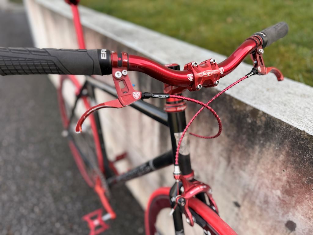 - Verkaufe ein absolut einzigartiges Kona Paddy Wagon. Der legendäre Reynolds 520 Stahlrahmen wurde mit viel Liebe zum Detail und ausschliesslich High-End Komponenten neu aufgebaut. Ein Traum für Ästheten und Pendler, die ein wartungsfreies, aber exklusives Bike suchen. Highlights & Custom-Komponenten: • Rahmen: Reynolds 520 Butted Cromoly Stahl (Kult-Rahmen, extrem langlebig und komfortabel). • Antrieb: Sturmey-Archer 2-Gang Kick-Shift Nabe. Schaltet durch kurzes Zurücktreten – keine Schaltkabel, maximale Clean-Optik. • Cockpit: • Vorbau: Hope XC (90 mm, rot eloxiert). • Steuersatz: Hope 1 1/8" (rot eloxiert). • Lenker: BLB (Brick Lane Bikes London). • Bremsanlage: BLB Bremshebel kombiniert mit Dia-Compe Bremszangen (zuverlässige Performance im Stadtverkehr). • Laufradsatz: • Vorderradnabe: Miche (hochwertige Bahnnabe). • Felgen: Klean. • Reifen: Tannus Vollgummi (100% pannensicher – nie wieder aufpumpen!). • Anbauteile: • Sattelstütze & Sattelklemme: BLB / Hope (passend in Rot). • Sattel: THE. Zustand & Besonderheiten: Das Velo ist ein absolutes "Sorglos-Bike". Dank der Vollgummireifen und der nabeninternen Schaltung gibt es praktisch keinen Wartungsaufwand. Die hochwertigen Komponenten von Hope und Miche heben das Bike weit über den Standard hinaus. Besichtigung und Probefahrt in 6210 Sursee möglich. Privatverkauf: Der Verkauf erfolgt unter Ausschluss jeglicher Gewährleistung, Garantie oder Rücknahme. VHB: 1'250.– CHF
