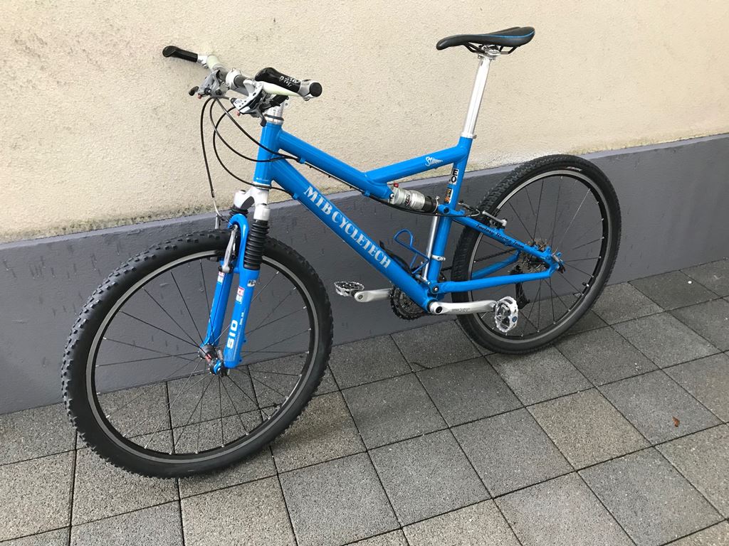 - Biete wegen Sammlungsauflösung: 1 x MTB Cycletech "Stinger" Team - Fully MTB: Original Zustand -> Mehr Schweizer Mountainbike Kult geht kaum! Farbe: *Factory Racing Edition* in sehr schönem SID blau Jahrgang 2001, delveloped by Butch Gaudy, MTB Cycletech Bern Grösse: Medium (480mm) Zur Ausstattung: Stinger Fullsuspension EASTON Ultra Elite (6061-T6) Aluminium Rahmen, made in Taiwan Tioga IS- Steuersatz 1 1/8" Ahead Rock Shox SID Dual-Air XC Federgabel, mit ca. 60mm Federweg DMR Air Luftdämpfer 40mm Federweg Shimano XT M750 3x9 27 Gang Schaltung (mit neuer Kette) Avid SD V-Bremsen mit neuen KoolStop All-weather Bremsbelägen IRC Mythos XC 2.1 Reifen vorne, Specialized Crossroad 1.9 hinten 26" NoPogo Wheels mit CITEC Naben mit spezieller Speichung, made in Germany Dieses Stinger war das legendäre Vorgängermodell vom MTB Cycletech "Opium", diese Team-Variante ist in einem äusserst guten Zustand, ab Service, kleinere Kratzer vom Lagern vorhanden. Es stammte ursprünglich vom VELO RACE Laden in Bern. Also ideal für Bike Fans der Schweizer Kult Marke MTB Cycletech oder für alle Mountainbike Enthusiasten. -> Probefahrt und Abholung (gegen Barzahlung) in ZH Kreis 10