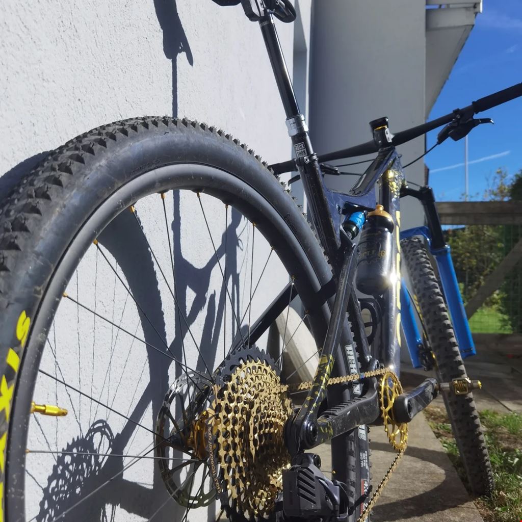 - Ein Highlight in Schwarz und Gold Federgabel: Sid Ultimate 120mm Dämpfer: Sidlux Ultimate Radsatz: Carbonfelgen von WTB mit Hydra Naben von I9 Bremsen: Sram Level Ultimate Schaltung: Sram GX Eagle AXS Kassette: XX1 Eagle Gold Kettenblatt: Absoluteblack Oval 34t in Gold Lenker: Trek RSL Onepice Carbonleker Sattelstütze: Rockshox Reverb AXS