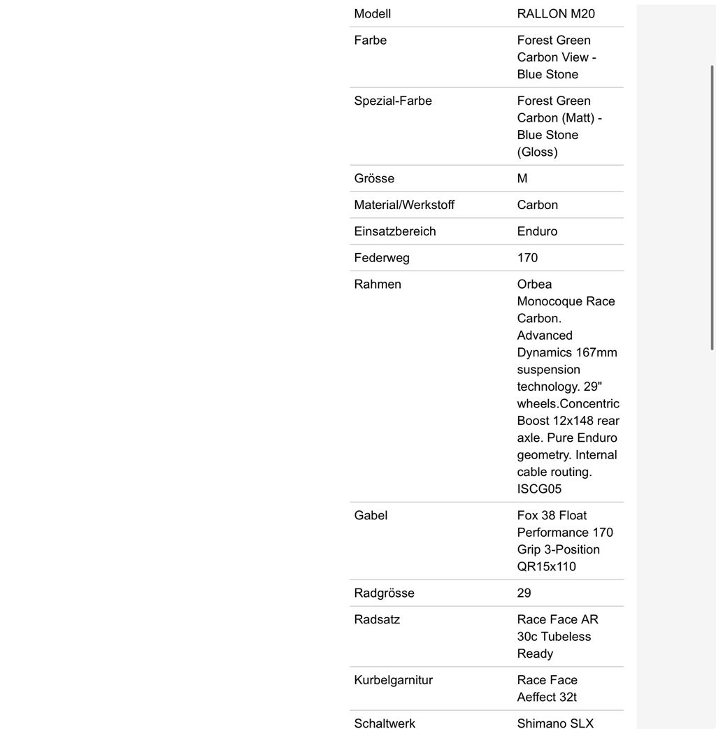 - ORBEA RALLON M20 Medium Forest Green Carbon View (Matt-Gloss) - Blue Stone (Gloss) Material Carbon Federweg 170 Rahmen Orbea Monocoque Race Carbon. Advanced Dynamics 167mm suspension technology. 29" wheels.Concentric Boost 12x148 rear axle. Pure Enduro geometry. Internal cable routing. ISCG05 Gabel Fox 38 Float Performance 170 Grip 3-Position QR15x110 Radgrösse 29 Radsatz Race Face AR 30c Tubeless Ready Kurbelgarnitur Race Face Aeffect 32t Schaltwerk Shimano SLX M7100 SGS Shadow Plus Schalthebel Shimano SLX M7100 I-Spec EV Kassette Shimano CS-M7100 10-51t 12-Speed Kette Shimano M6100 Bremse Shimano M6120 Hydraulic Disc Kettenführung/Kettenschutz e*thirt. CL55 30-36t black Sattelstütze OC Mountain Control MC21, 31.6mm, Dropper Sattel ERGON SM Enduro Bereifung Maxxis Assegai 2.50" WT FB 120 TPI 3C Maxx Terra EXO+ TR