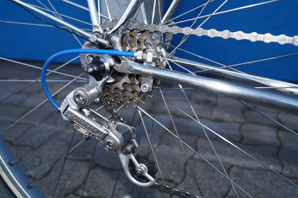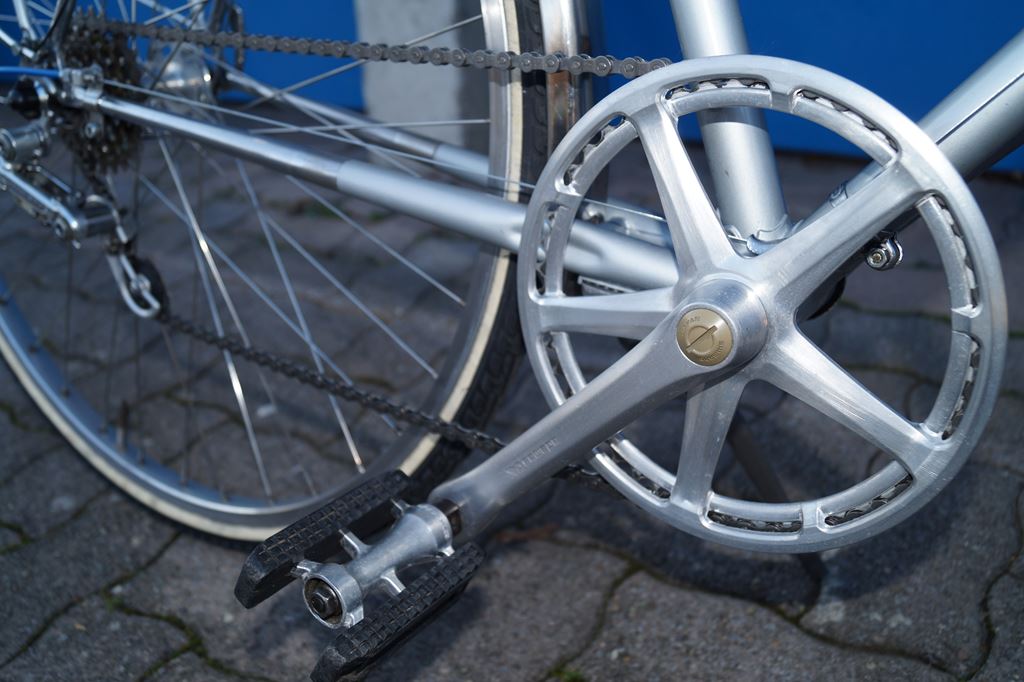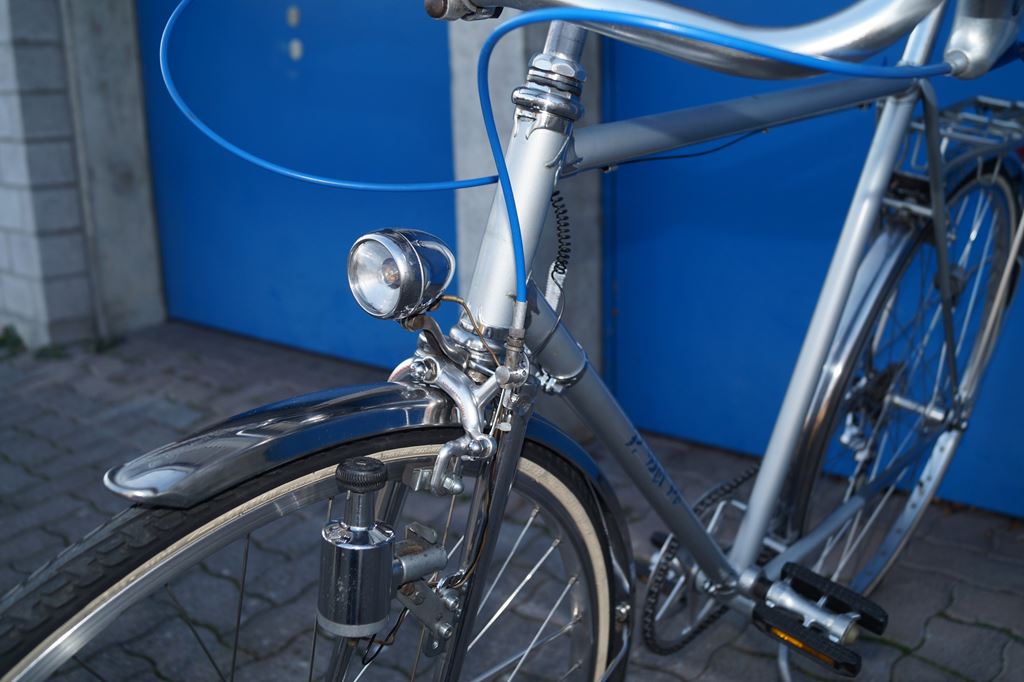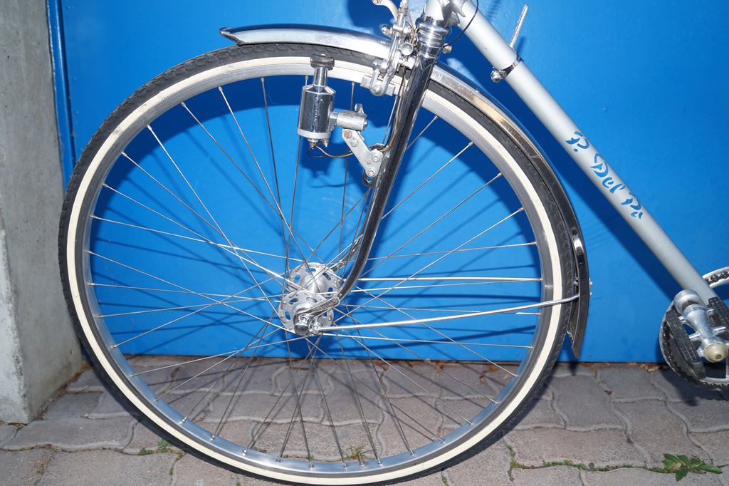 - Del Po «Gigolo» Fünfgänger, 1979, Rahmennummer 85066 Rahmengrösse Sitzrohr Mitte–Mitte 55 cm, Oberrohr Mitte–Mitte 56.5 cm Rahmen Reynolds «A Quality» mit kompletten Nervex Professional Muffensatz, Gabel- und Hinterbauenden verchromt Zahnkranz Fünfgang Regina Oro 14-22 Umwerfer Shimano 600 Kurbel Adamas AX von Shimano Naben/Felgen Hochflansch Bahnvelonaben / Wolber 85 Champion (Mavic) Bremsen Weimann Komponenten Vorbau Philippe Lenker Shimano Campione Del Mondo Sattel Brooks B15 Licht Lucifer Aus der kleinen, inzwischen leider verschwundenen zürcher Kunstschmiede von Pietro del Po in die Neuzeit hinübergerettet hat sich diese Augenweide in elegantem Silbergrau mit verchromten Muffen. Der filigran gelötete Stahlrahmen ist sehr schön erhalten mit wenigen Mini-Lackschäden. Wer als Zürcher mit italienischem Flair sonst gern chic unterwegs ist, ist hier bestens bedient. Das Fahrrad sorgt für ein zeitgemässe Fahrgefühl. Idealerweise für eine Körpergrösse so zwischen 165 und 185cm. Denn die Rahmenhöhe beträgt 55cm italienisch gemessen, Oberrohr Mitte-Mitte ca. 56.5cm. Sehr seltener, handverarbeiteter, gemuffter und gelöteter Stahlrohrrahmen mit Chrommuffen im neuwertigen Originalzustand. Bremszüge und -hüllen, Griffgummis, Sattel, Kette und Pneu sind neu. Alles gereinigt, gefettet, Räder zentriert und neu aufgebaut.