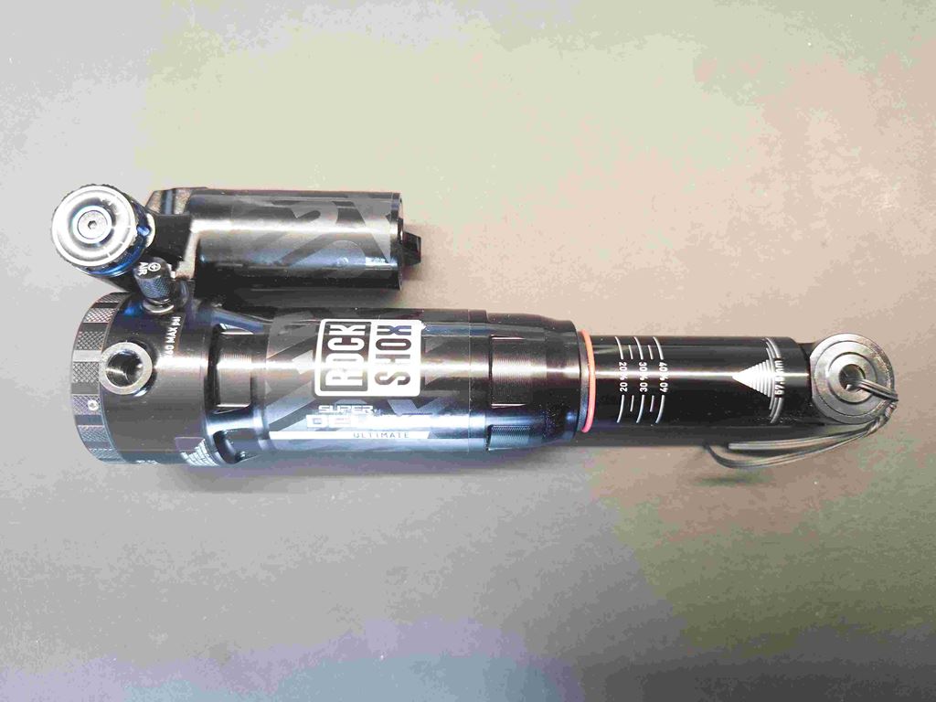 - Fabrikneuer RockShox Super Deluxe Ultimate Dämpfer, aus einem SCOR 4060 demontiert (nie gefahren) RS-SDLX-ULT-C1 - 03T30871078 Eye to eye / Stroke: 205x57.5(TR) Air volume: DebonAir Linear Remote: n/a Hose length/Cable Exit: n/a Model designator (SR): Ultimate Damper Type: RC2T Hydraulic Bottom Out Rebound tune: Linear Compression tune: L Pedal tune: n/a Lockout force: 320 Color (Shock body): Black Color (Decal): Matte Polar Foil Decal orientation: A Shaft Eyelet: Trunnion 30x8 Body Eyelet: Bearing Damping adjustments: Extl rebnd, 2 pos (open/firm), Hi & Low Speed comp adj Volume reducer: 0 Neg 2 Pos Check Tune: 0 - Light E-Bike Approved: E-bike Approved Rebound Clicks: 15 Max Air Pressure (PSI): 360