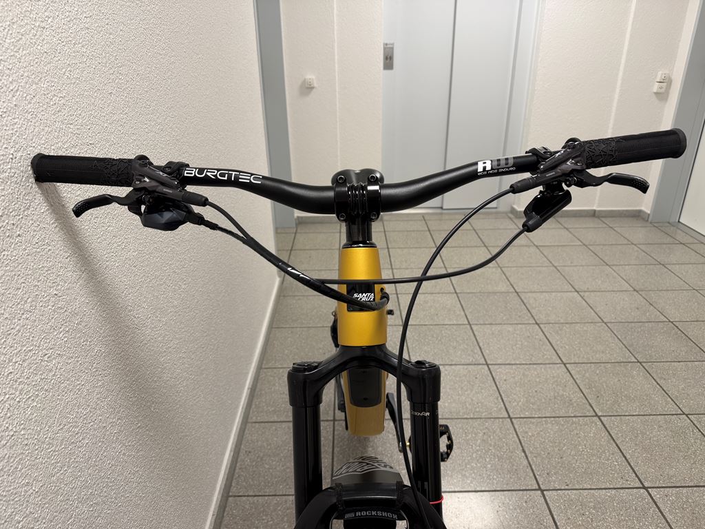 - Santa Cruz Bronson Ausstattung: * Rahmen: Santa Cruz Bronson C Carbon (Mullet - 29" / 27.5") * Schaltgruppe: SRAM GX 12-fach * Fahrwerk: RockShox Lyrik Select & RockShox Deluxe Select Plus 160 und 150 Federweg) * Bremsen: Shimano Deore XT (4-Kolben) * Teleskopstütze: RockShox Reverb * Laufräder: Raceface AR30 Offset * Cockpit: Burgtec / Deity * Kette: SRAM * Zustand: sehr gepflegt * Rahmenschutzfolie * e*thirteen Naben * e*thirteen Kettenschutz * ohne Pedale * Frisch ab Service inkl. Fahrwerk