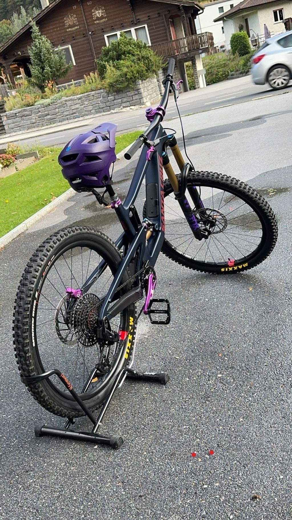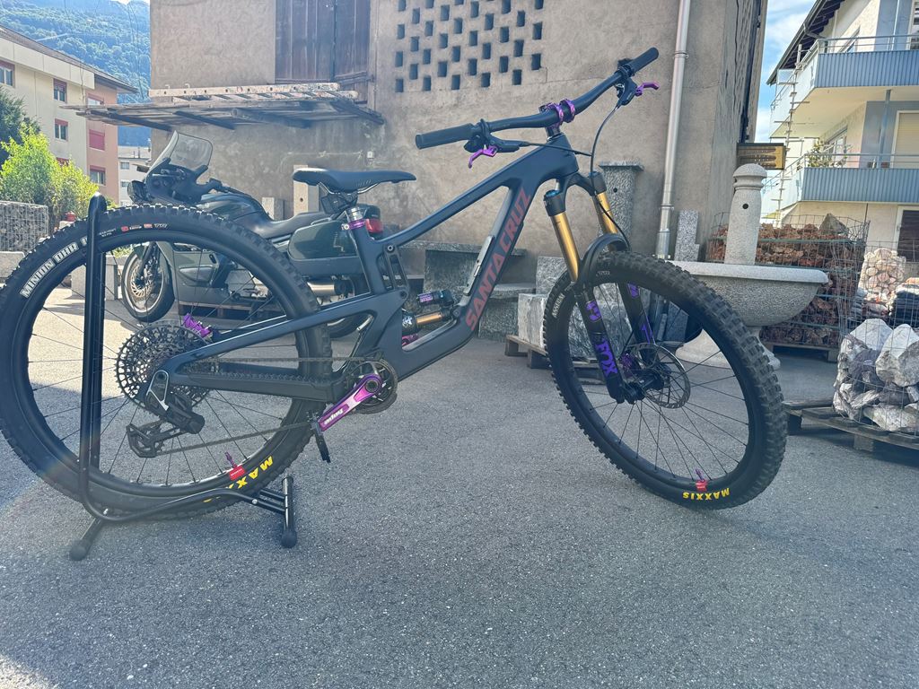 - Santa Cruz Nomad CC 2024 – High-End Custom Build – Nur 1x gefahren Neuwertiger Zustand. Originalrechnung vorhanden – wird bei Besichtigung oder auf Anfrage vorgelegt. Ich verkaufe hier mein Santa Cruz Nomad CC 2024, komplett custom aufgebaut nach meinen Wünschen. Das Bike wurde 2024 neu bei Rodeo Bike Co. gekauft und nur 1x gefahren – absolut neuwertiger Zustand. Grund für den Verkauf: Ich besitze noch ein zweites Bike und brauche dieses Schmuckstück schlicht nicht. Custom Setup (Top Komponenten) • Rahmen: Santa Cruz Nomad CC Carbon – 2024 • Gabel: Fox 38 Factory Kashima • Dämpfer: Fox Float X2 Factory Kashima • Laufräder: Santa Cruz Carbon Felgen (bombenstabil & super leicht) • Schaltung: SRAM GX Eagle AXS – kabellos • Sattelstütze: SRAM Reverb AXS – kabellos • Bremsen: TRP Dominion – limitierte Edition in Violett (extrem selten!) • Kurbel: HOPE – hochwertig & leicht • Pedale & Vorbau: Burgtec – in passender, edler Farb-Kombi • Reifen: Maxxis – neuwertig Damit hast du ein extrem cleanes Cockpit: nur 2 Bremsleitungen, sonst alles wireless. Das Bike ist optisch und technisch ein absolutes Premium-Gerät, perfekt für Enduro, Bikepark und harte Trails.