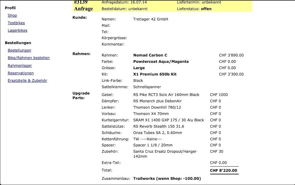 - Santa Cruz Nomad Carbon 2014 (Gr. L) - Wie neu - Frisch gewartet - VB Zu verkaufen ist mein kaum benutztes und topgepflegtes Santa Cruz Nomad (Modelljahr 2014, Rahmengrösse L). Der Aqua/Magenta Powdercoat-Lack ist in einwandfreiem Zustand. Wegen einer gesundheitlichen Erkrankung konnte ich sie leider seit 2016 nicht mehr fahren. Sie stand seither durchgehend trocken und geschützt im Keller. Zustand & Highlights: Rahmen: Grösse L, wie neu, keine Stürze, keine Risse oder Dellen. Kilometerstand: Unter 1000 km – das Rad ist quasi eingefahren. Premium-Aufbau: Das Rad wurde damals dem X1 Premium 650b-Kit ausgestattet und fachmännisch von Trailworks AG in der Schweiz aufgebaut. Wartung: SOFORT FAHRBEREIT! Komplettservice am 15.01.2026 bei Werkstatt Bikehub Zürich. Alle Arbeiten sind dokumentiert. Die längere Standzeit wurde dabei berücksichtigt. Ausstattung im Detail: Rahmen: Santa Cruz Nomad C 2014, Grösse L, Powdercoat Aqua/Magenta Aufbau: X1 Premium 650b-Kit montiert von Trailworks AG. Gabel: RockShox Pike RCT3 Solo air 160mm Dampfer: RockShox Monarch plus DebonAir Schaltung: SRAM Kurbelgarnitur: SRAM X1 1400 GPX 175 / 30 Bremsen: Shimano XT Sattelstütze: RS Reverb Stealth 150 31.6 Das Rad kann in Winterthur besichtigt und abgeholt werden. Bei ernsthaftem Interesse gerne melden für eine Probefahrt.
