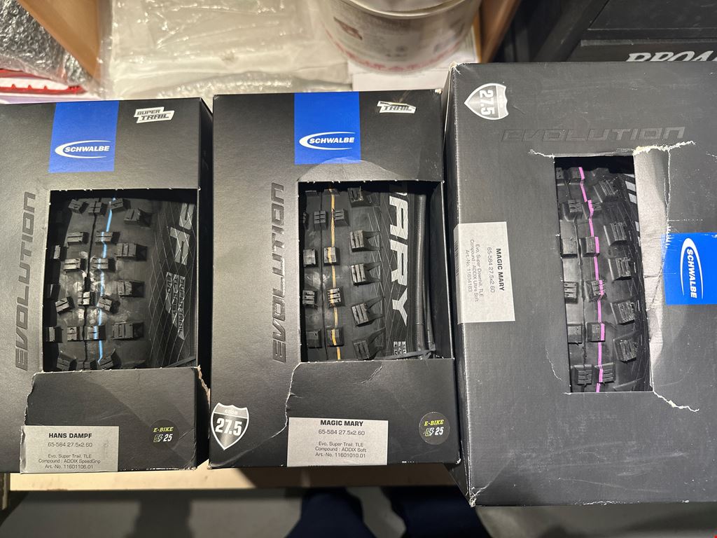 - Inserat aktualisiert am 29.03.2026: Zu verkaufen neue, unbefahrene 27.5 und 29 Zoll Enduro und E-Bike Reifen: Preis ist immer pro Reifen! 29 x 2.5 Pirelli Scorpion RACE Enduro EN M. EVO DH 1 Stk. vorhanden => Preis: 35.- 29 x 2.6 Schwalbe MAGIC MARRY, Super Gravity, Addix Soft 2 Stk. vorhanden => Preis: 35.- 29 x 2.4 Schwalbe MAGIC MARRY Super Trail, Addix Soft 2 Stk. vorhanden => Preis: 30.- 27.5 x 2.6 Schwalbe MAGIC MARRY Super Trail, Addix Soft 1 Stk. vorhanden => Preis: 30.- 27.5 x 2.6 Schwalbe MAGIC MARRY Super Downhill, Ultra Soft 1 Stk. vorhanden => Preis: 30.- 27.5 x 2.6 Schwalbe Hans Dampf, Super Trail, Addix Speed Grip 1 Stk. vorhanden => Preis: 25.- 27.5 x 2.6 Michelin E-Wild, Front 2 Stk. vorhanden => Preis: 25.- 27.5 x 2.6 Continental Kryptotal – R Enduro Soft 1 Stk. vorhanden => Preis: 35.- 27.5 x 2.6 Continental der Baron 1 Stk. vorhanden => Preis: 20.- 29 x 2.4 WT Maxxis Minion DHR II 3C Maxx Grip DD TR 1 Stk. vorhanden => Preis: 35.- 29 x 2.4 WT Maxxis Shorty DHR II 3C Maxx Grip DD TR 1 Stk. vorhanden => Preis: 35.- Die Reifen können verschickt, abgeholt oder auch entlang der Autobahn Oensingen – Bern übergeben werden.