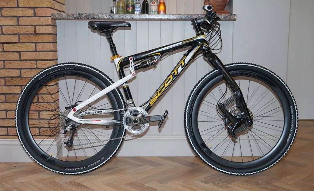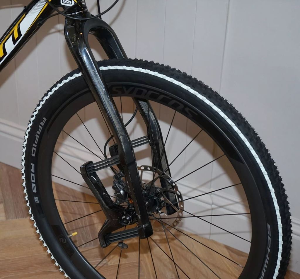 - RAHMENGABELN & STEUERSATZ: – Scott Spark Vollcarbon mit DT Swiss X313 Carbon-Hinterradfederung, integriertem CaneCreek-Steuersatz mit konischem Lenker, Lauf Leverzone TR 29 Carbon-Federgabeln, Hope eloxierter goldfarbener Q/R-Sattelstützenklemme. Die Rahmengröße ist M. Die Sattelstütze misst 17 Zoll (Mitte zur Mitte der Sattelklemme) und das Oberrohr 22,5 Zoll (Mitte zur Mitte). LAUFRADSATZ: Syncross Rp1.0 Deep Section Carbon-Scheibenbrems-Radsatz mit 12-mm-Durchsteckachse, brandneue Schwalbe Rapid Rob-Reifen (die wie erwähnt wegen der Bodenfreiheit nicht am Hinterrad passen) und die originalen Continental GatroSkin 700x28c-Straßenreifen. SCHALTUNG: Trvativ Sram XX Carbon-Kurbelgarnitur, 28-42-Kettenblätter, 175-mm-Kurbelarme, Sram XX Tretlagerumwerfer, XT-Schaltwerk mit langem Käfig, Shimano-Kassette (11-34), XT-Bremsen und -Schalthebel. LENKER, VORBAU, SATTEL & SATTELSTÜTZE: Syncross FL1.0 Carbon-Downhill-Vorbau 80 mm, Raceface Next SL Carbon-Lenker 64 cm mit Ergon GP1-Griffen, Selle Italia Gel Flow „Man“-Sattel mit Carbon-Patch, DMR-Pedale und schließlich eine ferngesteuerte, höhenverstellbare Rockshox-Federsattelstütze