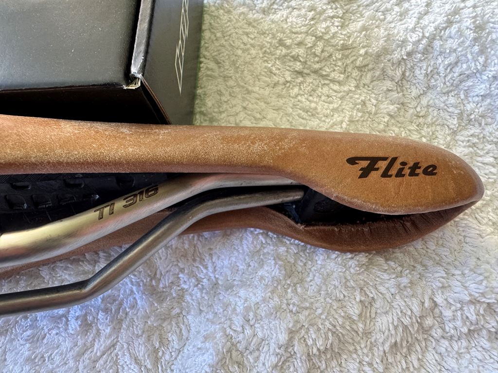 - Selle Italia Flite Sattel mit Echtlederüberzug und Titangestell. Breite L1, 146 mm. Farbe braun.