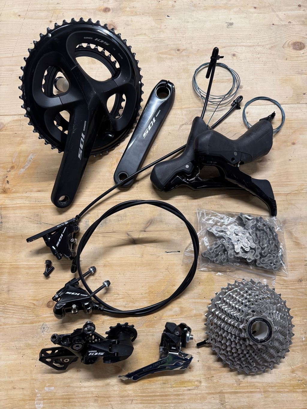 - Komplette Schalt-Bremsgruppe Shimano 105 für Rennrad oder Gravel gebraucht, neuwertige Funktion: hat weniger als 500km abgespult 2x11 Fach, Kasette 11-34, Kurbel 50/34, Kurbellänge 170mm Bremse braucht neue Bremsleitungen und Entlüftung ohne Bremsscheiben und Tretlager