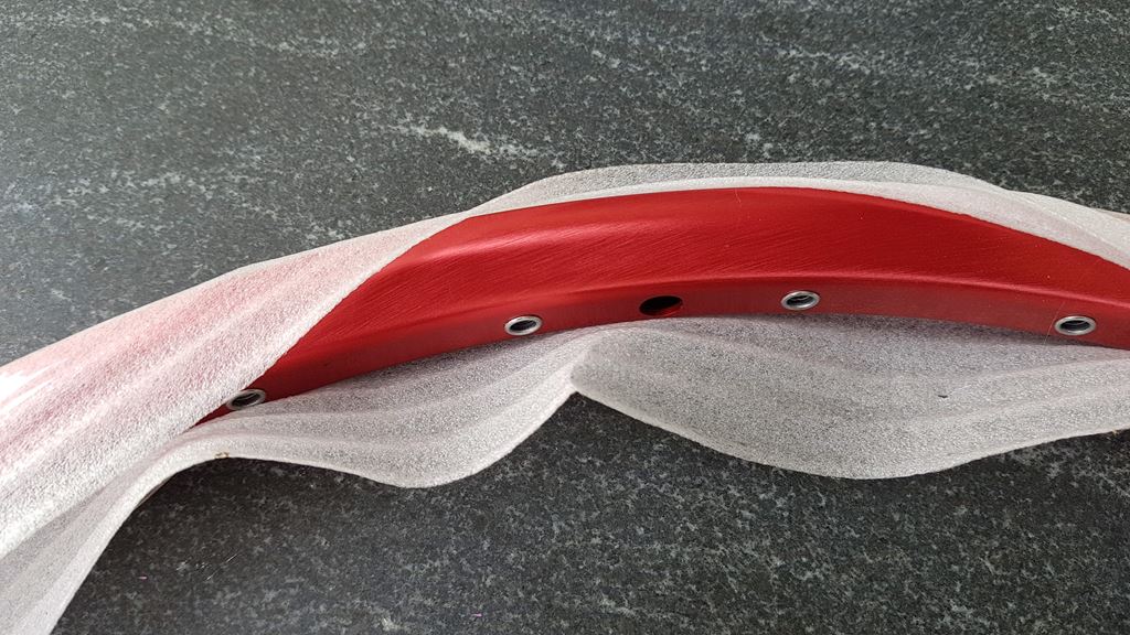 - Neue Felge Achtung die rote Eloxfarbe ist tendenziell heller als andere rote Eloxalteile. Zudem ist zu beachten dass die Felge für Autoventile gebohrt ist und es beim Abdichten für Tubeless auf die richtige Ventilreduktion zugegriffen wird