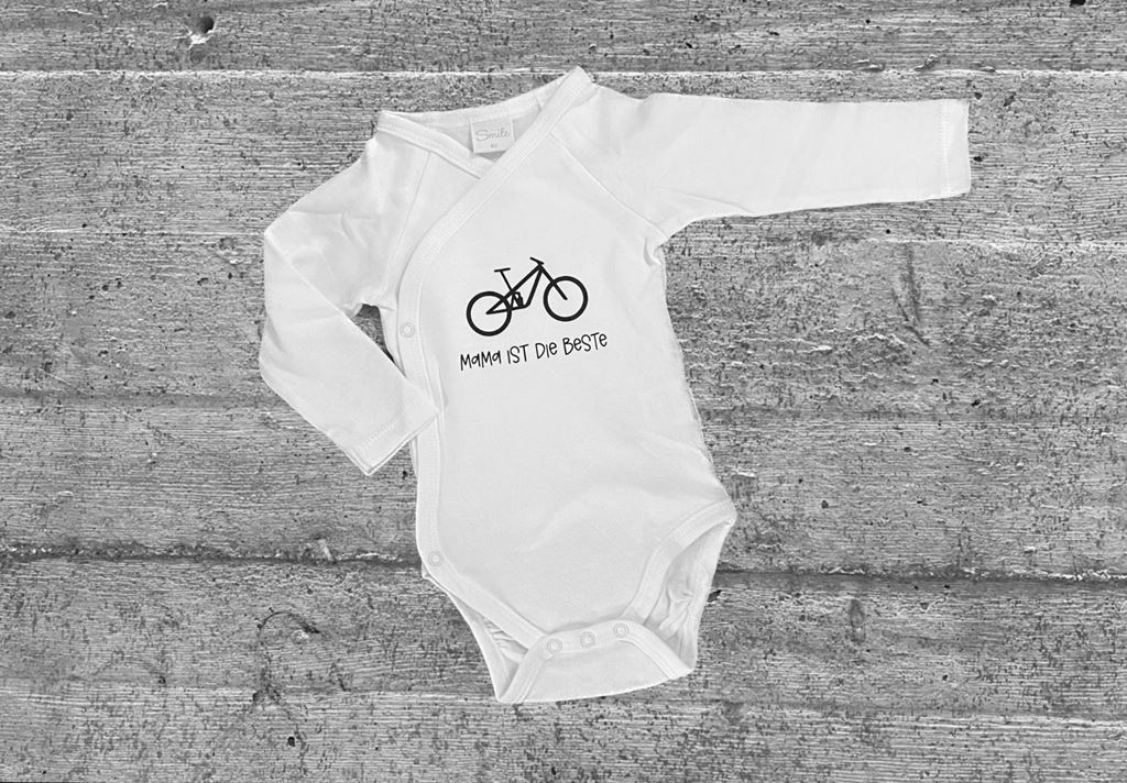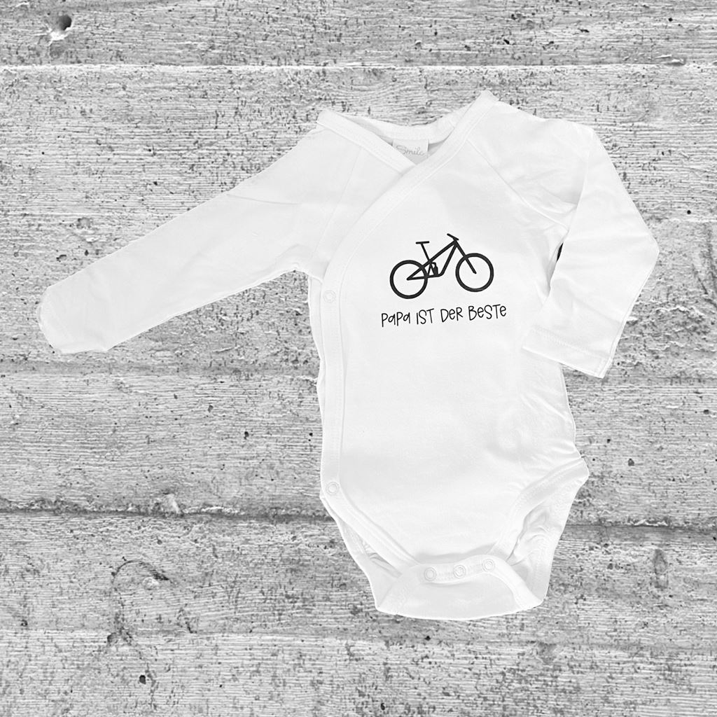 - Langarm oder kurzarm Body für Mountainbike Fans. Weiss mit Bike Icon und Aufschrift „Papa ist der Beste“ bzw. „Mama ist die Beste“. Erhältlich in verschiedenen Grössen (Beispielbild Grösse 62)": Erhältliche Grössen: 50 / 56 / 62 / 68 / 74 Text individualisierbar + CHF 5.- Material: Bio Baumwolle Das Body ist neu.