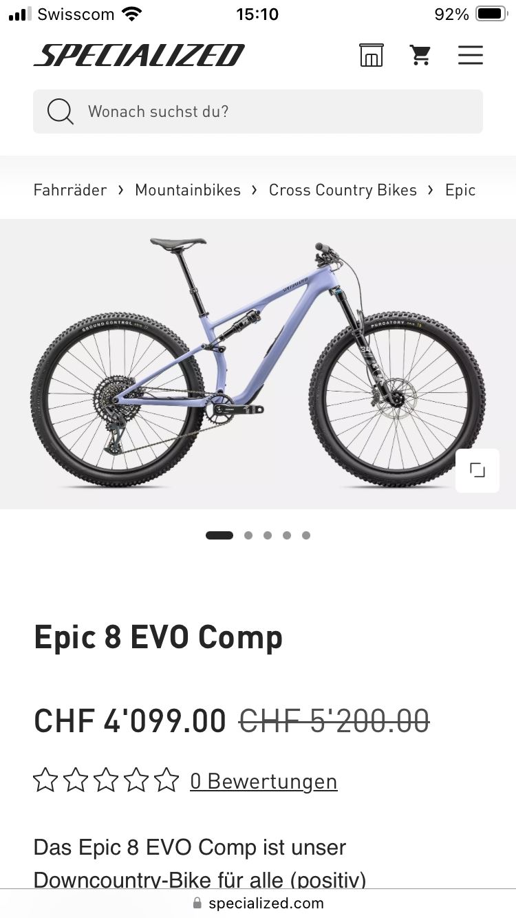 - Ich wollte schon immer mal am Nationalpark Bike Marathon teilnehmen. Habe mir dafür im Mai 2025 das EPIC 8 gekauft. Ein echt tolles Bike. Super schnell bergauf und bergab trotzdem viel Spass. Habe nun nach dem Rennen aber festgestellt, dass ich doch lieber weiter Enduro fahren möchte. Daher will ich, wenn auch schweren Herzens, das EPIC wieder verkaufen. Ist quasi neu. Gerne zur Probefahrt nach Thalwil oder Zürich kommen, es wird Dir gefallen. Verkauf ohne Pedale ———- Hier noch die Specs vom Hersteller: Leichter × Leistungsfähiger × Effizienter = Ein neuer Superlativ Das Specialized Epic 8 EVO Comp ist ein Downcountry-Bike für alle, die auf den schnellsten Trails der Welt die KOMs oder QOMs jagen wollen. Es ist leistungsfähiger, effizienter und leichter als jemals zuvor und überzeugt mit einer optimierten Kinematik und einem speziellem Dämpfertuning. Merkmale Specialized Epic 8 EVO Comp - Rahmen aus FACT 11m Carbon mit SWAT Staufach - FOX 34 Performance Federgabel 130mm - FOX Float Performance Dämpfer 120mm - SRAM Code Bronze Scheibenbremsen - SRAM GX Eagle 12-fach Schaltung - Specialized Purgatory / Ground Control Reifen - X-Fusion Manic Dropper Post