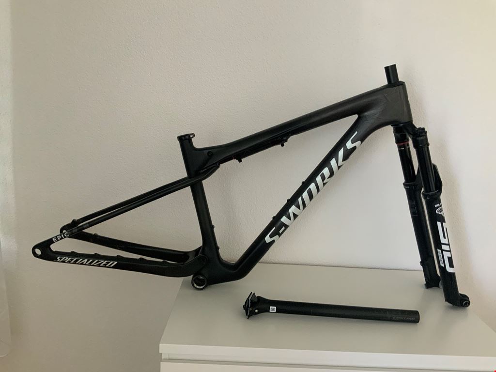 - Framekit inkl. Carbon Sattelstütze, Rockshox SID SL Federgabel mit Raceday 3P Kartusche verbaut (Braineinheit dabei) leichte Kratzer auf Federgabel und Sitzstrebe rechts (kein Sturz, ist an der Mauer abgerutscht :-(