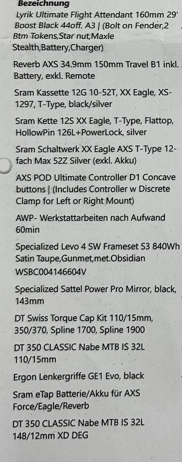 - Verkaufe mein geliebtes Specialized S-Works Turbo Levo 4 das ich Custom aufbauen lies. Rahmengrösse S3 Schweren herzens muss ich es leider Verkaufen da ich von einem 18kg schweren SL E-MTB komme und es mir leider doch etwas zu schwer ist. Das Bike ist in einem einwandfreien zustand und verfügt über einen 840Wh Akku der einen 111Nm starken Motor antreibt. Aktuell ist das Bike knapp 2000km gefahren. Teile die Verbaut wurden siehe auf den letzten Bildern. Der Rahmen wurde Zusätzlich mit eine Lackschutzfolie von swisscycleprotection komplett Foliert, sprich der Rahmen hat so gut wie keine Gebrauchsspuren.