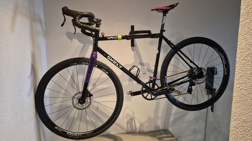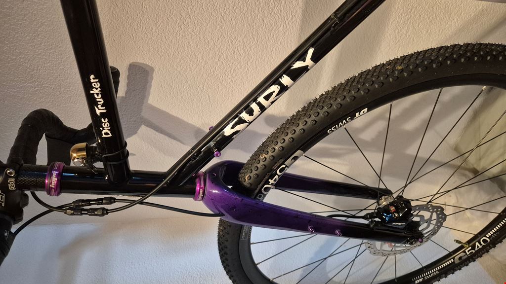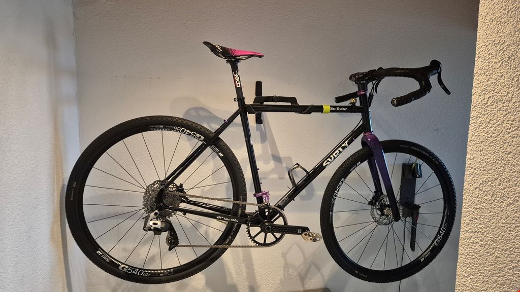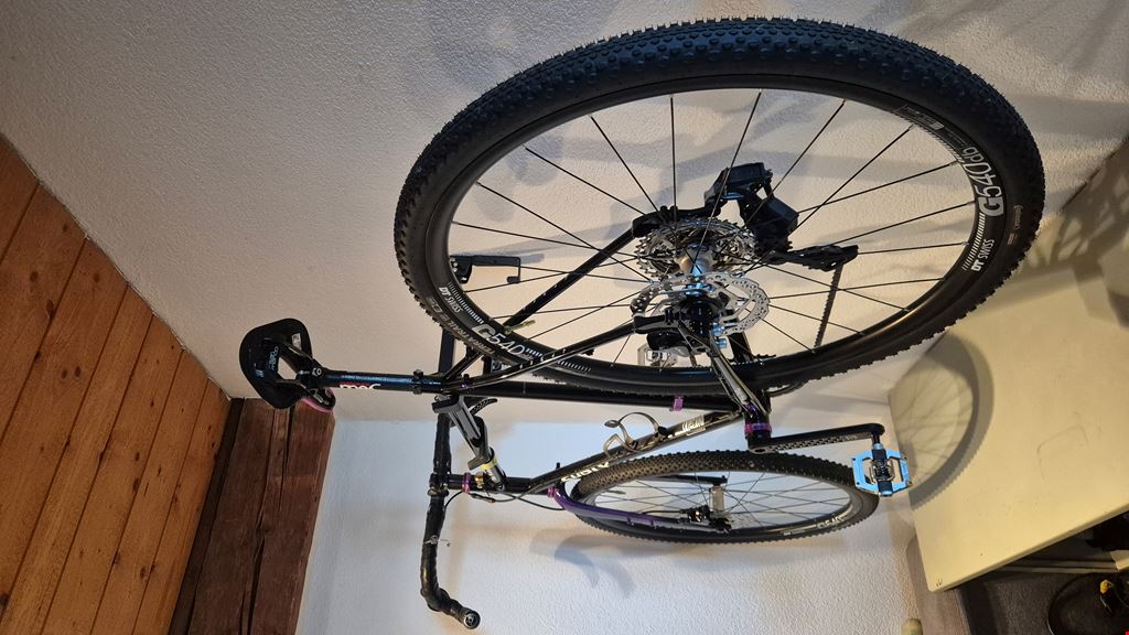 - État neuf, vendu comme sur les photos Fourche carbone Columbus, Pédales auto CRANKBROTHERS Dérailleur électrique AXS avec blips Sram sur guidon Freins Trp Hylex, avec fourche d'origine acier noir Livraison possible autour de Fribourg