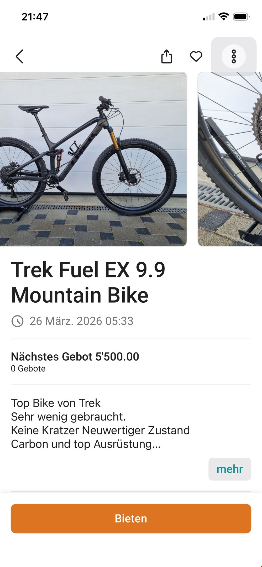 - Hallo Radsportfreunde…! Ich verkaufe mein traumhaftes und elegantes TREK Fuel EX 9.9, komplett aus Carbon mit Sram XX1 Eagle 1x12 Fach Schaltgruppe, 29 Zoll DT SWISS XMC Carbon Felgen, u.v.m.! Das TREK befindet sich in einem sehr guten Zustand. Es wurde immer regelmäßig gewartet und ist stets sorgfältig gepflegt worden. Ein Hammer-Bike!! Das letzte Bild zeigt einen 1:1 Preisvergleich Occassion. Ich bin über CHF 2000.- günstiger und mein Bike hat keinerlei Mängel, ist unfallfrei, etc. !! Neupreis: CHF 10’000.- Rahmengrösse M: Geht von 1.65m bis und mit 1.80m, je nach Beinlänge und Einstellung. Ausgestattet mit exzellenten Komponenten: - TREK FUEL EX 9.9 Rahmen aus Mountain OCLV Carbon, mit Knock-Block Technologie und BOOST 148 System! - Sram XX1 1x12 Fach Schaltgruppe, mit XX1 Kurbel aus CARBON und XX1 Schalthebel aus CARBON! - SRAM Guide ULTIMATE Bremsanlage, mit enormer Bremskraft und ULT Bremshebel aus CARBON! - leichte DT SWISS XMC 1200 Spline RED Edition 29 Zoll Laufräder aus CARBON (Hoher Neupreis)! - FOX FACTORY 34 FLOAT EVOL Kashima Coat GOLD 130mm Federgabel - FOX FLOAT EVOL 130mm Kashima Coat GOLD Dämpfer ! - FOX TRANSFER Absenkbare Sattelstütze mit Bontrager evoke RXL Sattel aus CARBON! - BONTRAGER PRO Lenker aus CARBON, mit Bontrager Pro Line Vorbau aus CARBON! - inkl. Crankbrothers Klickpedalen und Carbon Flaschenhalterung! Besichtigung sowie Probefahrt sind selbstverständlich möglich. Bei Interesse, Fragen aller Art oder Besichtigungstermin rufen Sie mich am besten direkt an, oder auch per sms/whatsapp gut erreichbar unter: 079 679 89 00. Mit besten Grüssen, D. K.