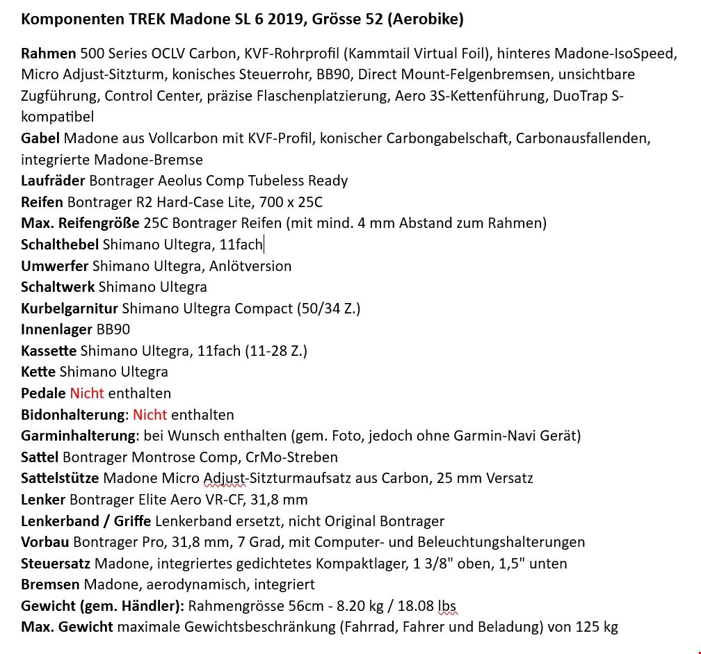 - Zu verkaufen infolge Nichtmehrgebrauch: TREK Madone SL 6 2019 Aerobike. Grösse 52 (empfohlene Körpergrösse: 163-168cm). Händlerbeschrieb: Das TREK Madone SL 6 profitiert von der fortschrittlichen aerodynamischen Performance und dem herausragenden Fahrverhalten der TREK Madone-Modelle. Es ist das ultimative Rennrad, das mit seiner herausragenden Race-Performance, den Aero-Laufrädern, dem vibrationsdämpfenden IsoSpeed-Entkoppler, den versteckten Zügen und seinem cleanen Look auf ganzer Linie überzeugt. Komponenten: gem. Foto / Printscreen im Beitrag. Zustand: Occasion, wenig gebraucht. Gem. Fotos im Beitrag (16.6.25). Übliche Gebrauchsspuren. Weitere Fotos (Details) auf Anfrage per Whatsapp. Testfahren: Das Aerobike darf gerne in Bern getestet werden. Bitte PN an mich. Danke. Gabriela, 076 472 91 90
