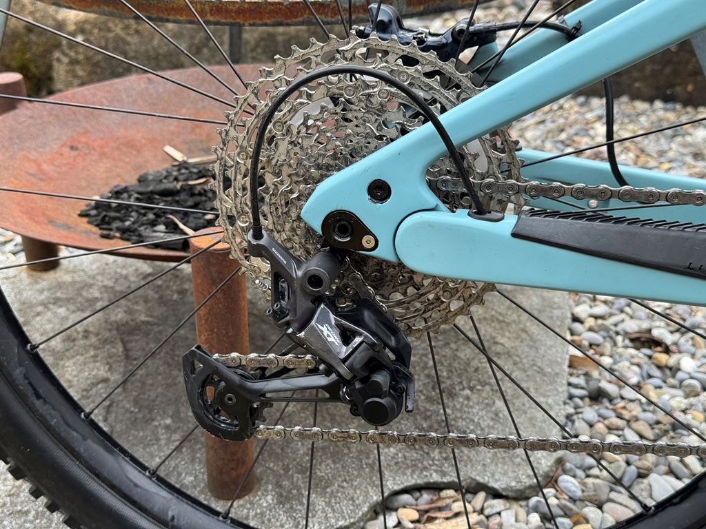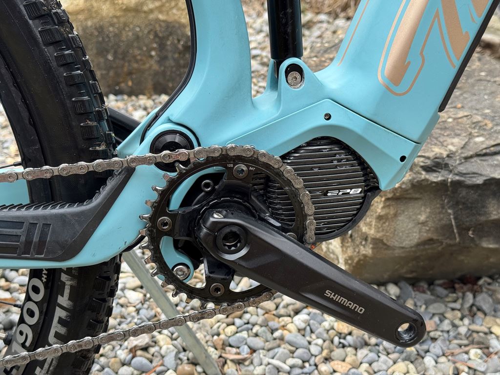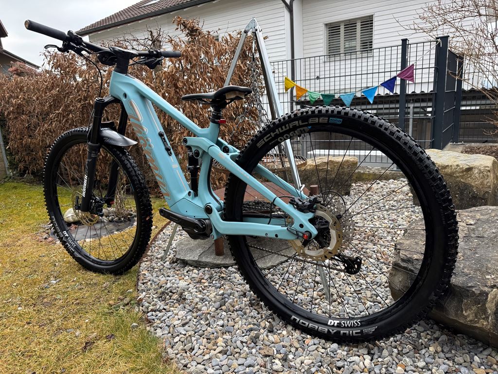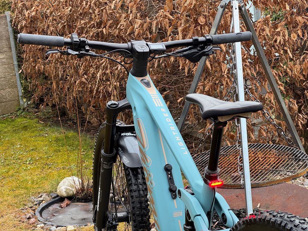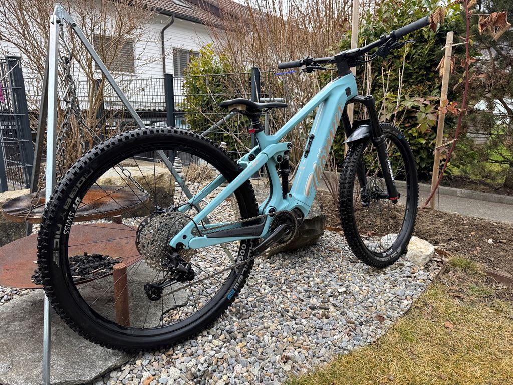 - Gekauft im April 2022 zu einem Preis von 7'215.- Ca. 800km Zu der Konfig unten, wurde ein hochwertiges Lupine Front und Rücklicht montiert mit direktem Anschluss an die Batterie und Steuerung vom Lenker aus. Grösse: S (16") Farbe: aquamarin Ausstattung Shimano SLX, 12-fach, 34, 10-51 Steuersatz Acros Thömus MTB TIC2 60-120mm Schnellspannachse DT Swiss RWS 148/12mm Boost Kettenstrebenschutz Thömus Lightrider E2 schwarz Ladegerät Thömus E2 Kettenblatt Shimano Steps 34Z 12-fach Kassette Shimano Deore 10-51Z 12-fach Wechsel Shimano X T 1x12-Fach Schalthebel Shimano SLX rechts I-Spec Kette Shimano SLX 12-fach Batterie Thömus E2 726Wh Batteriecover Thömus E2 Bremse Shimano SLX 4-Kolben vorne & hinten Motor Shimano Steps Mid Ship Position EP8 Kurbel Shimano Steps 170mm oder 165mm Display Shimano EP8 (Farbdisplay) Vorderrad DT Swiss H1900 29" 30mm Boost Tubeless Hinterrad DT Swiss H1900 29" 30mm Boost Tubeless Gabel Marzocchi Bomber Z2 29" 150mm schwarz Dämpfer Fox Float-A DPS E-MTB 140mm Bremsscheibe Shimano SLX Ø203mm CL Bremsscheibe Shimano Steps Ø180mm CL Griffe ESI Silicone racers edge schwarz Vorbau Thömus TIC -8° | 45mm Spacer Thömus Integrated | 2cm Lenker Thömus Alu Riser 15mm | 740mm Sattelstütze KS LEV-I 125mm Ø31.6mm 390mm Remotehebel Kind Shock Alu Ø 22.2m Sattelklemme Thömus Alu geschraubt Sattel, Pedale Wellgo Normal Spritzschutz Thömus MTB vorne Pneu Schwalbe Nobby Nic 62-622 29x2.4 SuperGround