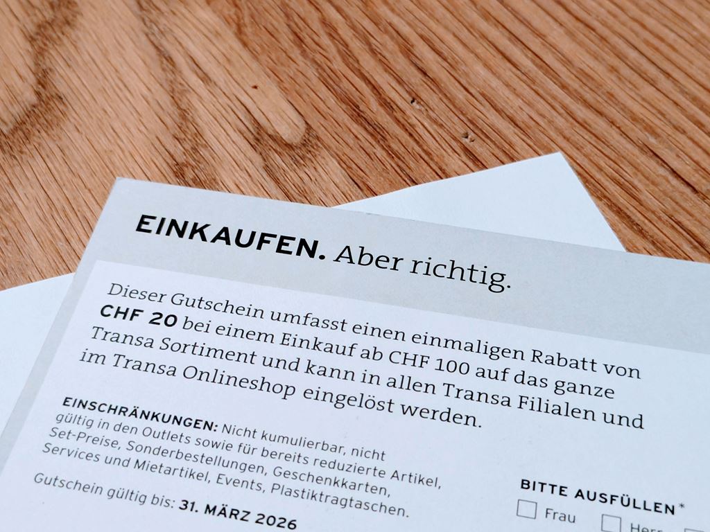 - Zum Verkauf steht eine virtuelle Geschenkkarte von/für Transa (und transa.ch) im Wert von 150 CHF. (Sie erhalten keine physische Karte, sondern einen Gutscheincode) Das Guthaben kann in den Filialen sowie online auf transa.ch eingelöst werden. (Bitte weitere Bedingungen auf dem Photo beachten) Zudem erhalten Sie einen Gutscheincode für einen einmaligen Rabatt von CHF 20 bei einem Einkauf ab CHF 100 auf das ganze Transa Sortiment (Bitte auch hier die Bedienungen auf dem zweiten Photo beachten). Somit können Sie einen Transa einkauf im Wert von CHF 170 tätigen, und bezahlen dafür nur CHF 140 - das sind fast 20% Rabatt! --- Bedingungen für Geschenkkarte: Der Geschenkkarten-Code können Sie im Transa Onlineshop bei der Bezahlung einlösen. Geben Sie dafür einfach im Feld «Geschenkkarten-Code» den Code ein. Kaufen Sie lieber vor Ort in einer der Filialen ein? Dann weisen Sie den Code an der Kasse vor. Beim Einlösen des Geschenkkarten-Codes müssen Sie nicht den vollen Betrag einlösen, Restguthaben bleibt gespeichert. Sie können den Code auch auf reduzierte Artikel und in Kombination mit Aktionen einlösen; Datum / Zeitraum: Der Gutschein ist bis 31.12.2026 gültig; Ort: Dieser Geschenkkarten-Code kann in allen Transa Filialen und im Transa Onlineshop transa.ch eingelöst werden.
