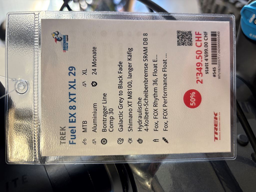 - Modell-Jahr 2023 Farbe Galactic Grey to Black Fade Basisfarbe schwarz Rahmengrösse XL Rahmenmaterial Aluminium Schaltung Shimano XT M8100, langer Käfig Bremsen Hydraulische 4-Kolben-Scheibenbremse SRAM DB 8 Bereifung Bontrager XR5 Team Issue, Tubeless Ready, 29 x 2.5 Radsatz Bontrager Line Comp 30 Kurbelgarnitur Shimano Deore M6120, 30 Z, 55 mm Kettenlinie, 170 mm Kurbelarmlänge Lenker Bontrager Line, Aluminium, 35 mm, 27,5 mm Rise, 780 mm Breite Vorbau Bontrager Elite, 35 mm, 0 Grad, 45 mm Länge Sattel Bontrager Arvada, Streben aus CrMo-Rohr, 138 mm Breite Sattelstütze TranzX JD-YSP39, 170 mm Hub, interne Zugführung, 34,9 mm Gabel Fox, FOX Rhythm 36, Float EVOL-Luftfeder Dämpfer Fox, FOX Performance Float X, 2-Positionen-Dämpfung Bei Interesse gerne Telefonisch melden. 034 491 20 00 Unseren gesamten Lagerbestand können sie auf unserer Webseite einsehen. www.brechbuehl-2rad.ch