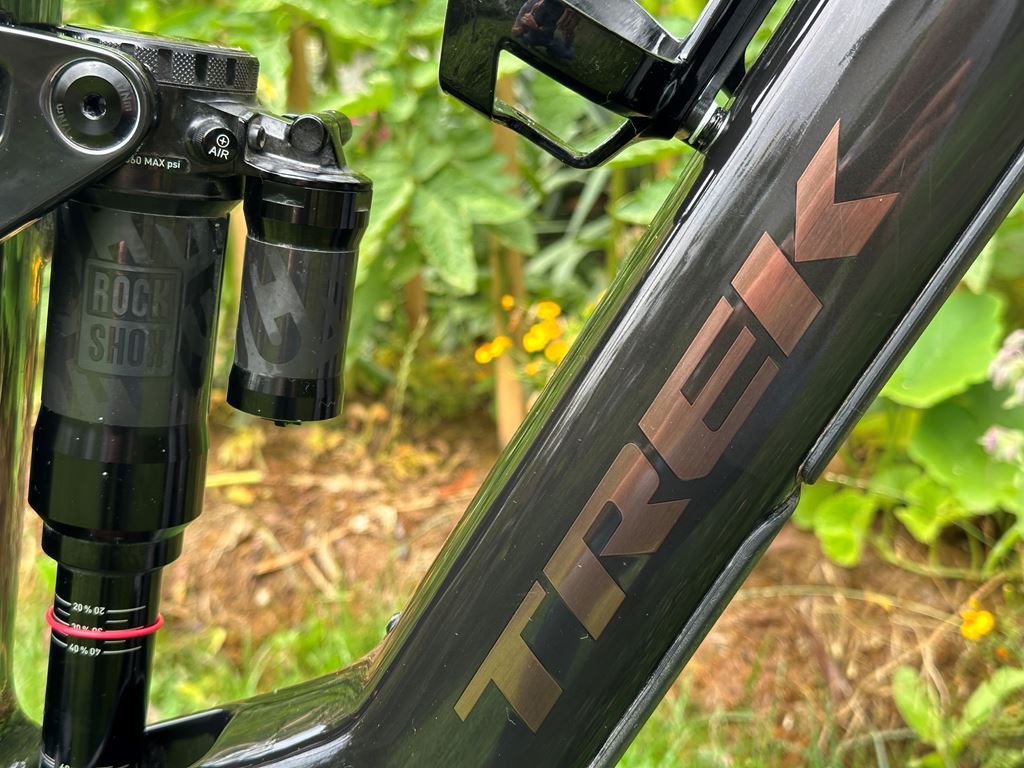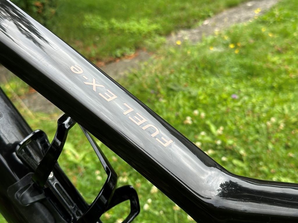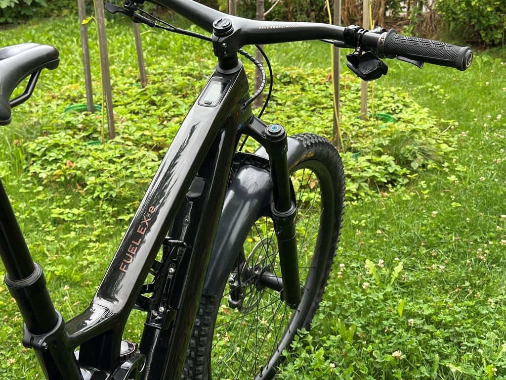 - Trek Fuel EXe 9.8 GX AXS mit XT-Bremsen, TQ-Motor, Carbon-Rahmen, -Räder, -Lenker. Grösse L Leichtes (18,5kg) Trail E-MTB in Topzustand, ab Service Grösse L (für Körpergrösse ca. 177 - 188 cm) Farbe Deep Smoke Kilometerstand: 1’500 km Ladezyklen: 39 (siehe Screenshots) Super spassiges Trailbike, sehr tourentauglich mit viel Rückenwind ;-), dazu schön leise und verspielt zu fahren. Das Bike ist in sehr gutem Zustand mit nur ganz wenigen Gebrauchsspuren. Ein Jahr alt, wurde nur im Sommer und moderat gefahren. Alles original Teile, aber mit Upgrade auf Shimano XT 4-Kolben-Bremsen und Continental Reifen Kryptotal Fr und Re (tubeless). Inkl. Schutzbleche und neue Originalgriffe (ohne Ergongriffe und SP-Connect Halterung). TQ-Software ist auf neustem Stand. Gefahren von einem Mitarbeiter eines Veloladens, das Bike wurde sehr gut gepflegt und gewartet. Verkauf wegen Neuanschaffung. Rahmen OCLV Mountain Carbon, herausnehmbarer Akku, interne Zugführung, Mino Link, ABP, Boost148, 140 mm Federweg Gabel RockShox Lyrik Select+, DebonAir Feder, Charger 2.1 RC Dämpfung, 15 mm Maxle Stealth Achse, 150 mm Federweg Dämpfer RockShox Super Deluxe Select+ RT, 205 x 60 mm Radsatz Bontrager Line Elite 30, OCLV Mountain Carbon, Tubeless Ready, Rapid Drive 108, 6-Loch-Scheibenaufnahme, SRAM XD Freilaufkörper, Boost148, 12 mm Steckachse, 29" Schaltung SRAM GX Eagle AXS (Funkschaltung) Lenker/Vorbau Bontrager RSL, integrierte Lenker/Vorbau-Einheit, OCLV Carbon, 27,5 mm Rise, gekürzt auf 790 mm Breite, Vorbau mit 0 Grad Rise, 35 mm Vorbaulänge Bremsen Shimano XT M8120, hydraulische 4-Kolben-Scheibenbremse, Scheiben 203mm vorne, 180mm hinten Motor TQ-HPR50, 50 Nm, 250 W max. Nenndauerleistung, 300 W Maximalleistung Batterie TQ 360 Wh, 39 Ladezyklen. Erweiterbar mit Rangeextender im Bidonhalter (nicht inkl.) https://www.trekbikes.com/ch/de_CH/bikes/mountainbikes/e-mountainbikes/fuel-exe/c/B346/