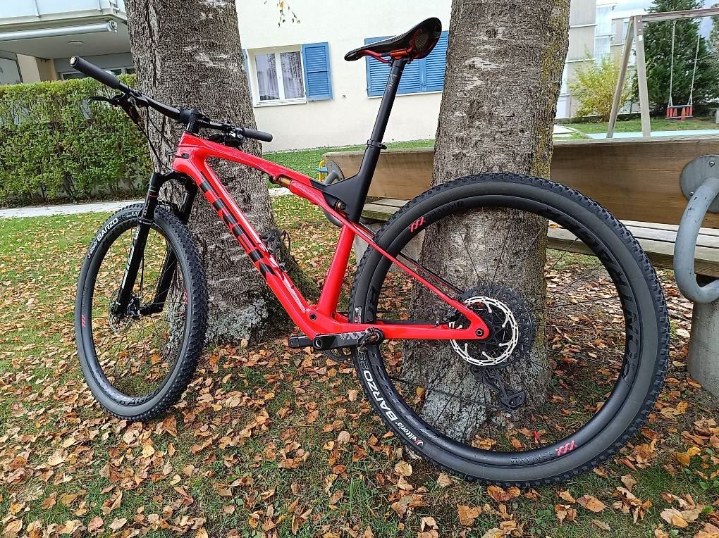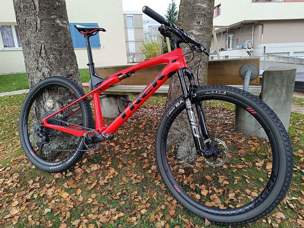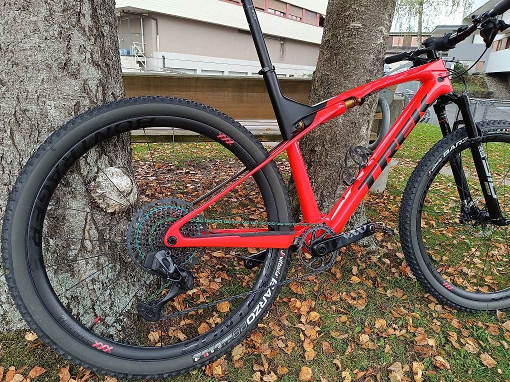 - Trek Supercaliber 9.9 XX1 AXS Gen 1 (Gr. XL) zu verkaufen- Der SRAM XX1 Eagle AXS-Antrieb ist intelligent, geschmeidig und komplett drahtlos. Unser exklusiver IsoStrut-Dämpfer bietet eine einstellbare, weiche Federung und sorgt für eine geschmeidige und effiziente Fahrt, ohne dir das Mehrgewicht eines vollgefederten Bikes aufzubürden. Gelenklose Sitzstreben sparen Gewicht und tragen dank ihrer Flexibilität dazubei, Unebenheiten auf dem Trail zu schlucken. Mit einer einfachen Drehung lassen sich mit TwistLoc für mehr Effizienz im Sprint und auf Anstiegen sowohl Federgabel als auch Dämpfer blockieren. Rahmen: OCLV Mountain Carbon Gabel: RockShox SID SL Ultimate Dämpfer: Trek IsoStrut, Fox Factory shock Lenker: Bontrager Kovee XXX, OCLV Carbon Schaltwerk: SRAM XX1 Eagle AXS Bremsen: SRAM Level Ultimate hydraulic disc, carbon levers Kurbelgarnitur: SRAM XX1 Eagle AXS Carbon Kassette: SRAM XG-1299 Eagle, 10-52, 12 speed Laufradgrösse: 29" Laufräder: Bontrager KOVEE Carbon Rahmengrösse: XL NP: über CHF 11'000.- Änderungen zur Standard Ausstattung sind folgende: andere Sattelstütze hydraulisch, Sattel und Vorbau Das Bike ist in einem top Zustand (neuwertig)! Es wurde grundsätzlich auf der Strasse und Feldwegen benützt. Fast keine Trails oder Geländeabfahrten. Denke das Bike kann ab 1.90m gefahren werden.
