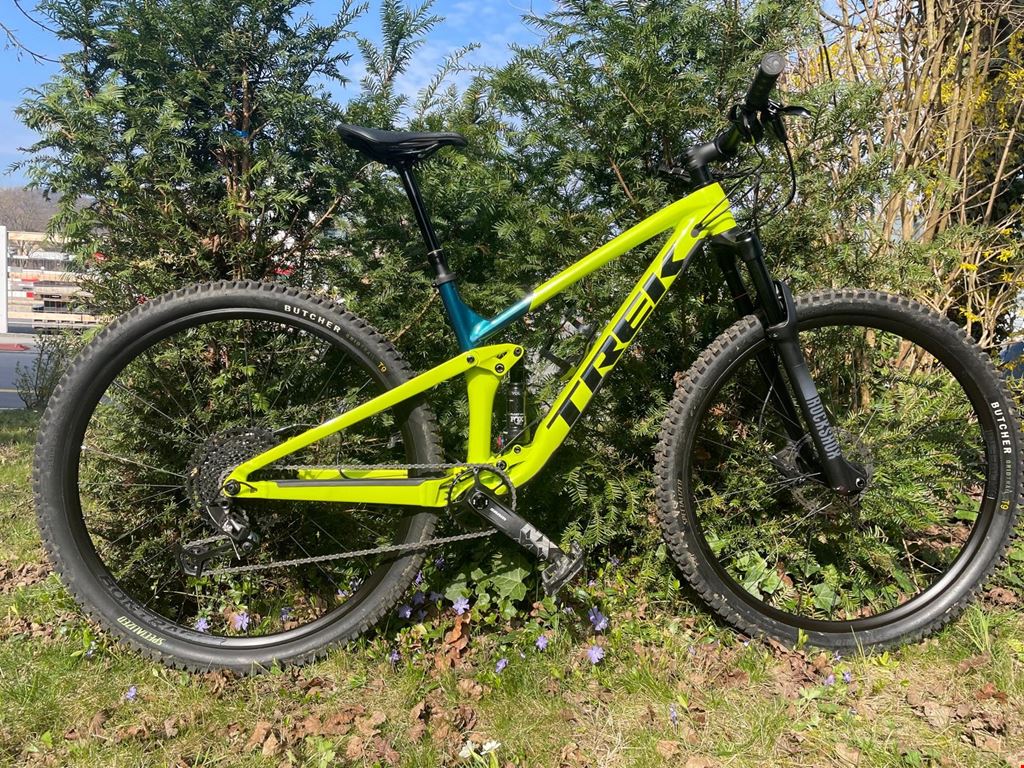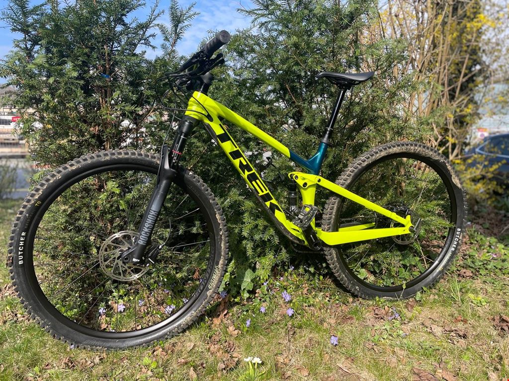 - Achtung vorab: Das Bike wird von meiner Partnerin in Wettingen verkauft! Bei Interesse stelle ich den Kontakt her. Das Bike wurde nur 3 Mal auf kurzen Touren gefahren, ist also praktisch neu. Es wurde auf Tubeless umgerüstet. Das Modell "Top Fuel 8 " von der Marke Trek aus dem Jahr 2021 ist ein vielseitiges Mountainbike, das für anspruchsvolle Trails und sportliche Fahrten konzipiert wurde. Der Rahmen des Top Fuel 8 besteht aus Alpha Platinum Aluminium und verfügt über ein konisches Steuerrohr sowie die Knock Block-Technologie, die das Verdrehen des Lenkers verhindert. Die interne Control Freak-Zugführung sorgt für eine aufgeräumte Optik und schützt die Kabel. Weitere Ausstattungsmerkmale des Rahmens sind ein Unterrohrschutz, ein Magnesiumumlenkhebel sowie die Mino Link-Technologie, die eine Anpassung der Geometrie ermöglicht. Das Active Braking Pivot (ABP) und der Boost148-Standard tragen zur Steifigkeit und Stabilität bei. Der Rahmen bietet einen Federweg von 115 mm. Das zulässige Gesamtgewicht des Bikes beträgt 136 kg, während das Gewicht des Fahrrads selbst bei 13 kg liegt. Dies macht es zu einer robusten und dennoch leichten Wahl für anspruchsvolle Fahrer. Für die Bremsleistung sorgen hydraulische Scheibenbremsen vom Typ SRAM Level T, sowohl vorne als auch hinten. Die vorderen und hinteren Bremsen sind mit SRAM Centerline-Scheiben ausgestattet, die jeweils eine abgerundete Kante und eine 6-Loch-Scheibenaufnahme haben. Die Scheibengröße beträgt vorne 160 mm und hinten ebenfalls 160 mm. Die Schaltung wird durch den SRAM NX Eagle 12-fach Schalthebel gesteuert, der präzise und zuverlässige Gangwechsel ermöglicht. Die RockShox Recon Gold RL-Gabel mit Solo Air-Feder und Motion Control-Dämpfung bietet einen Federweg von 120 mm und sorgt für eine komfortable Fahrt auf unebenem Gelände. Der Kurbelsatz besteht aus dem SRAM NX Eagle DUB mit einem 32-Zähne-Stahlkettenblatt und einer Kurbelarmlänge von 175 mm. Der Zahnkranz ist ein SRAM PG-1230 Eagle mit einer Übersetzung von 11-50, was eine große Bandbreite an Gängen bietet. Der Lenker ist ein Bontrager Rhythm Comp aus Aluminium mit einer Breite von 750 mm und einem Rise von 15 mm. Die Griffe sind Bontrager XR Trail Comp mit Nylonklemmen, die für guten Halt sorgen. Der Vorbau ist ebenfalls ein Bontrager Rhythm Comp mit einer Länge von 70 mm und der Knock Block-Technologie. Der Laufradsatz besteht aus Bontrager Kovee Hohlkammerfelgen, die Tubeless Ready sind und eine Innenweite von 23 mm haben. Die Naben sind aus Aluminium mit gedichteten Lagern und verfügen über eine 6-Loch-Scheibenaufnahme. Die vordere Nabe hat eine Boost110-Standardachse mit einer 15-mm-Steckachse.