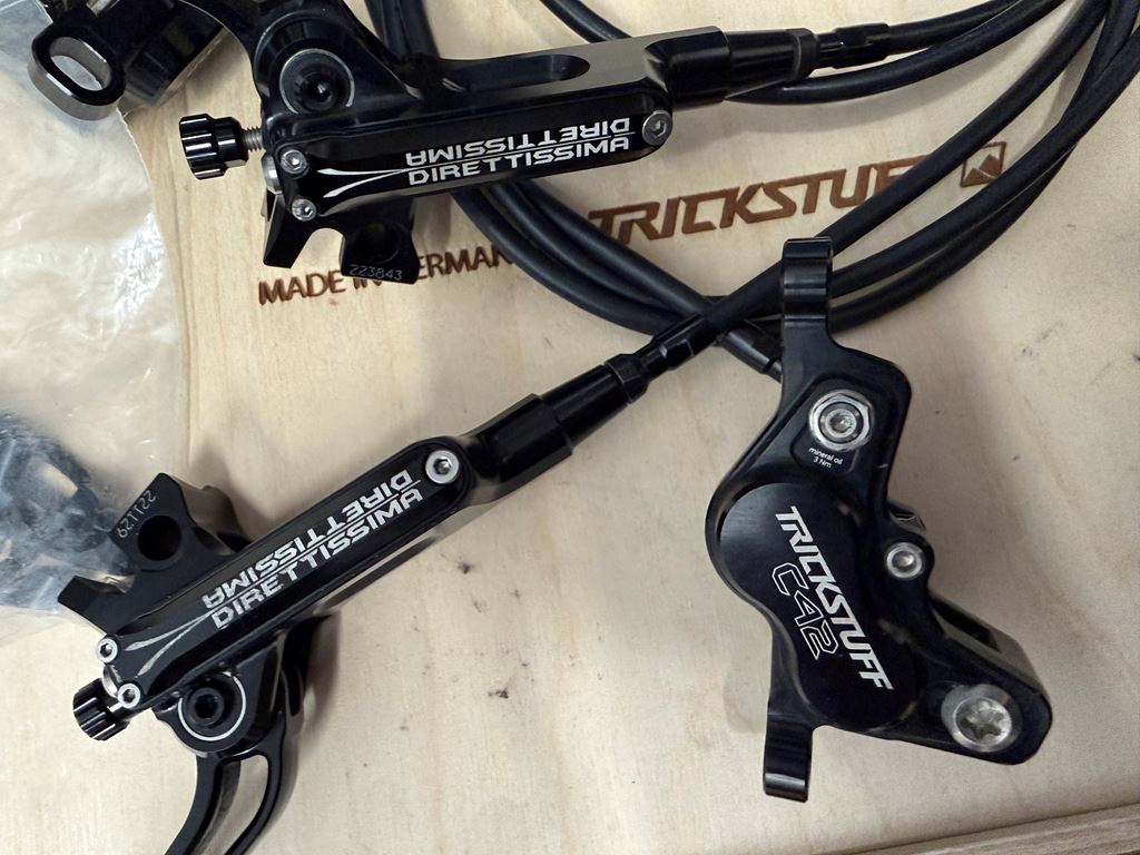 - Trickstuff Direttissima mit den neuen C42 Bremssätteln in super Zustand. Inklusive Hebelweitenverstellung und Schellen zur Lenker Montage. Leitungslänge ca. 78cm vorne und 152cm hinten