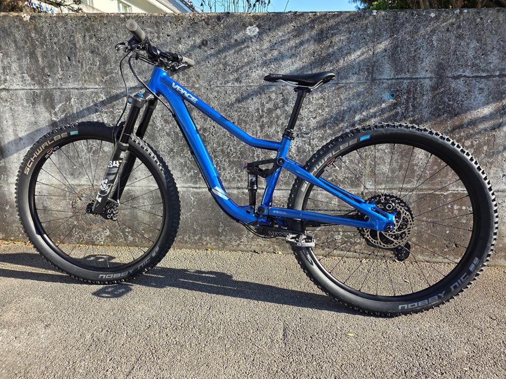 - Relativ leichtes Fully-Trail/Enduro-Bike, speziell entwickelt für Jugendliche mit einer Körpergröße von 140–160 cm (maximales Fahrergewicht: 55 kg). Das Bike wurde sorgfältig gepflegt und sieht aus und fährt sich praktisch wie neu. Keine Dellen oder größeren Kratzer. Oberrohr mit Folie geschützt. Die Reifen sind in gutem Zustand. Gewicht: 12,5 kg (ohne Pedale) Federgabel FOX 34 Performance 140 mm Dämpfer: Fox Float EVOL (130mm federweg) Shaltung: SRAM GX Eagle 12-fach Bremsen: Magura MT Trail Sport Reifen: 27.5-Zoll Schwalbe Nobby Nic 2.35 Dropper: KindShock 125mm Kurbel: VPACE 145mm 30T Pedale: Crankbrothers Stamp7 pedals (small)