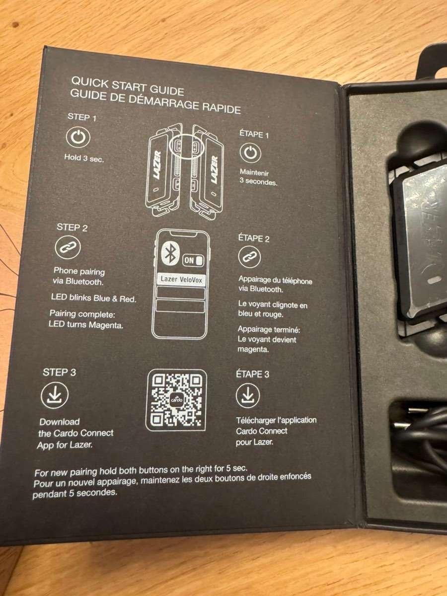 - Lazer Headset VeloVox | Open-Ear Communication & Audio Experience technische Daten: Geräteabmessungen: 73 x 25 x 13 mm Material Gehäuse: Kunststoff Touchscreen: nein Energieversorgung: fest verbauter Lithium-Ionen-Akku Ladeanschluss: USB-C max. Betriebsdauer: k.A.) Schutzklasse: IP54 Konnektivität: Bluetooth App: Cardo-Connect-App, Shimano-E-TUBE-App Farbe: schwarz Gewicht laut Hersteller: 19g (ein Open-Ear-Hörer) Gewicht selbst gewogen: 34g (beide Open-Ear-Hörer)