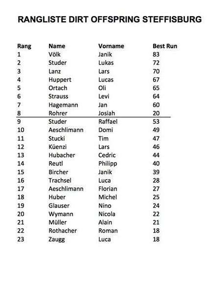 Nach Ralf Schneider in Schlattingen und Lucas Huppert in Rüti gewann gestern mit Jannik Völk ein Tourneuling das Saisonfinale des Dirt Offspring. Für ihn hat sich also die weite Anreise aus Deutschland gelohnt. Die Einheimischen Lukas Studer und Lars Lanz belegten die Ränge zwei und drei.